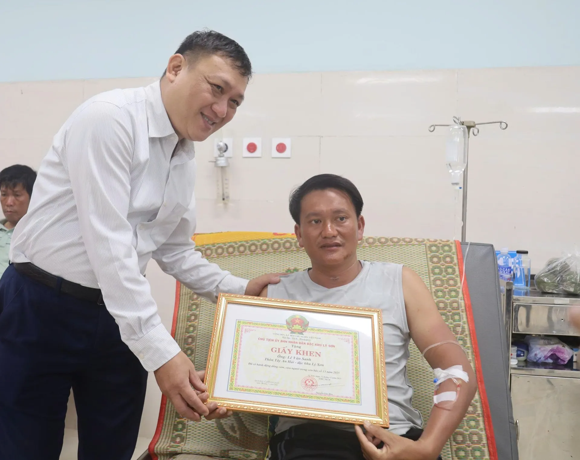 Sáng 10/11, ông Nguyễn Văn Huy, Chủ tịch UBND đặc khu Lý Sơn (tỉnh Quảng Ngãi) đã đến Trung tâm Y tế Quân - Dân y đặc khu Lý Sơn trao tặng Giấy khen cho ông Phan Duy Quang và ông Lê Văn Sanh vì “đã có hành động dũng cảm, cứu người trong cơn bão số 13”; đồng thời trao Giấy khen cho ông Lê Thanh Hùng - chủ tàu An Vĩnh Express vì “đã có thành tích cứu hộ, cứu nạn trong cơn bão số 13”.