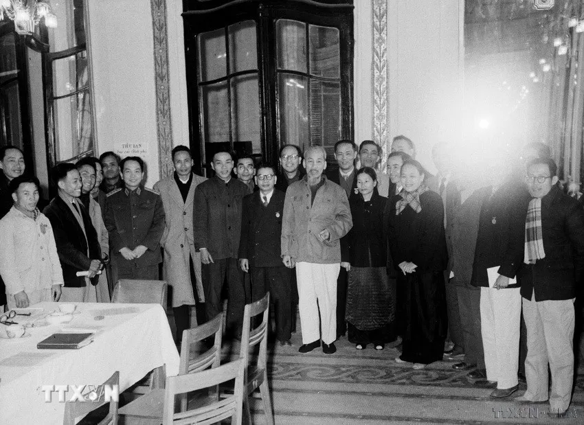 Chủ tịch Hồ Chí Minh hô khẩu hiệu “Việt Nam nhất định thống nhất” tại lễ bế mạc kỳ họp thứ 6, Quốc hội khóa I. Tại kỳ họp, Quốc hội quyết định sửa đổi Hiến pháp, Chủ tịch Hồ Chí Minh được cử làm Trưởng ban sửa đổi Hiến pháp (1956). (Ảnh: TTXVN)