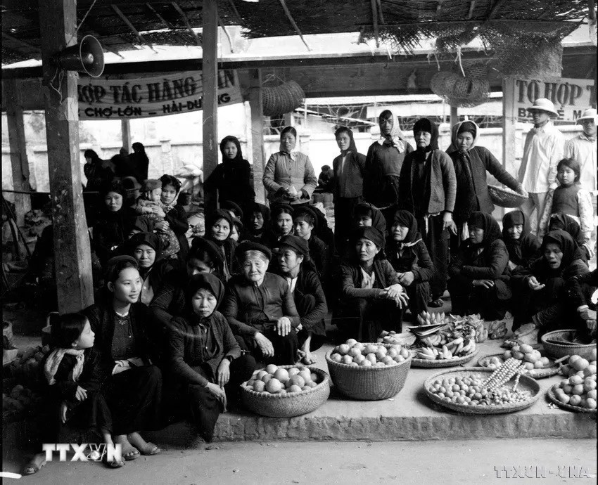 Bà con tiểu thương chợ Lớn Hải Dương theo dõi qua đài phát thanh về buổi họp Quốc hội thông qua Hiến pháp mới (31/12/1959). (Ảnh: TTXVN)