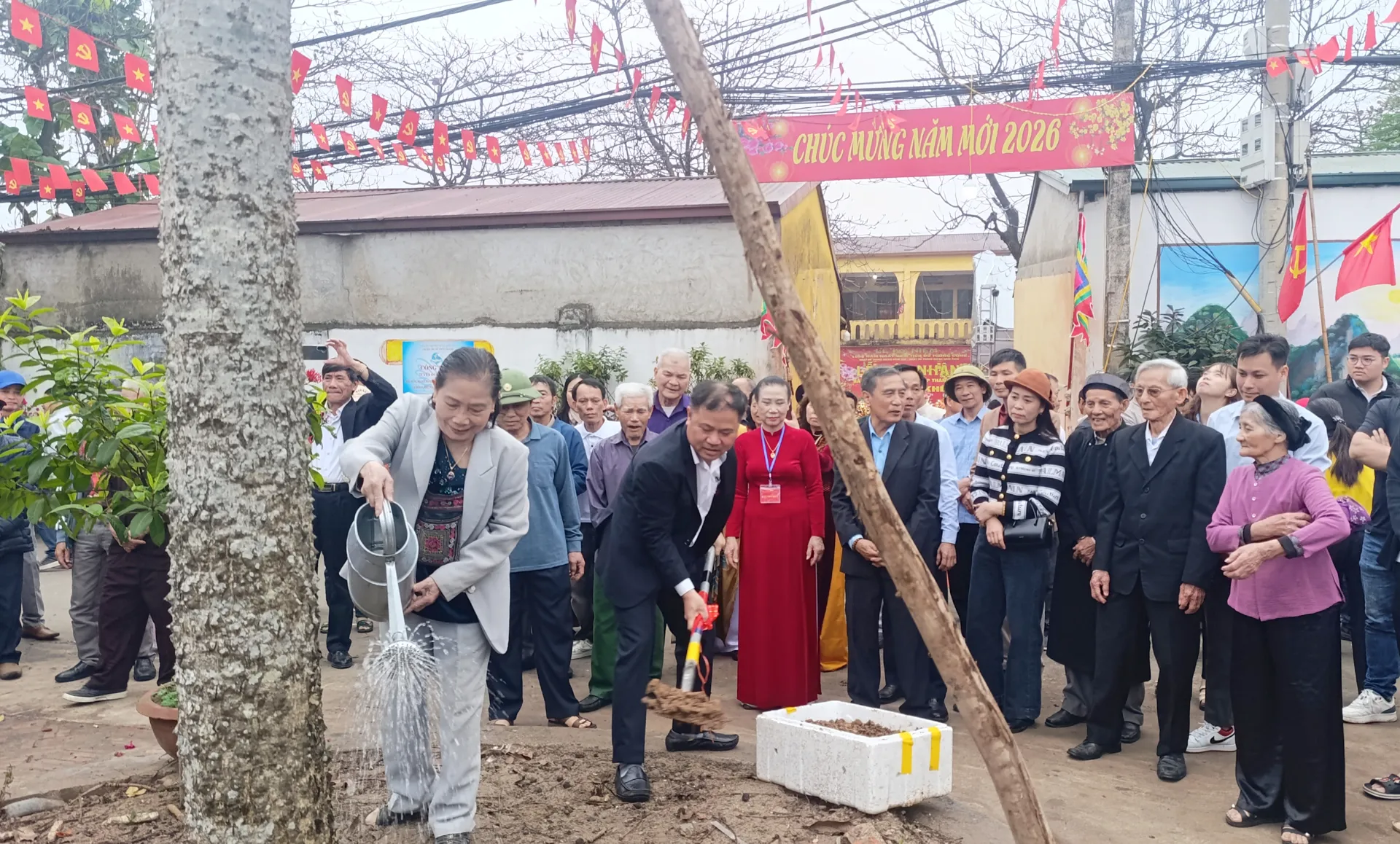 Lãnh đạo xã Quốc Oai trồng cây tại Đình làng.