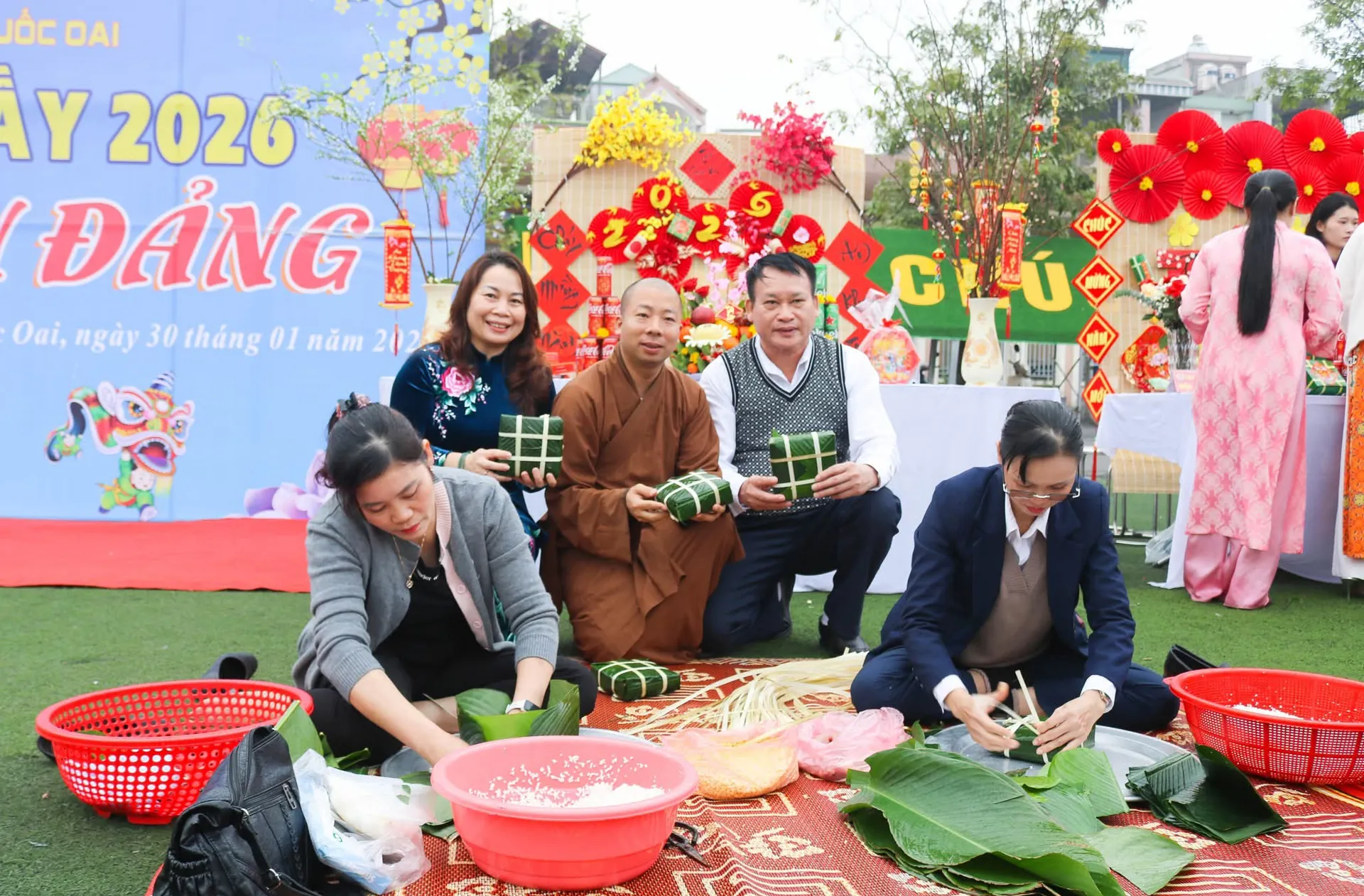 Ngay từ sáng sớm, sân vận động xã Quốc Oai đã rộn ràng không khí ngày hội với sự tham gia đông đảo của Nhân dân, các đoàn thể, cơ quan, đơn vị và nhà hảo tâm. Không gian chương trình được tổ chức trang trọng, đầm ấm, mang đậm sắc Xuân truyền thống, tạo cảm giác gần gũi, sẻ chia và gắn kết. Trong khuôn khổ chương trình, Ban tổ chức đã tổ chức nhiều nội dung phong phú, mang đậm bản sắc truyền thống và tính cộng đồng như: văn nghệ chào mừng, hội thi gói bánh chưng, bày mâm ngũ quả Tết, trưng bày sản phẩm đặc trưng của địa phương và các gian hàng “0 đồng” phục vụ người dân có hoàn cảnh khó khăn.