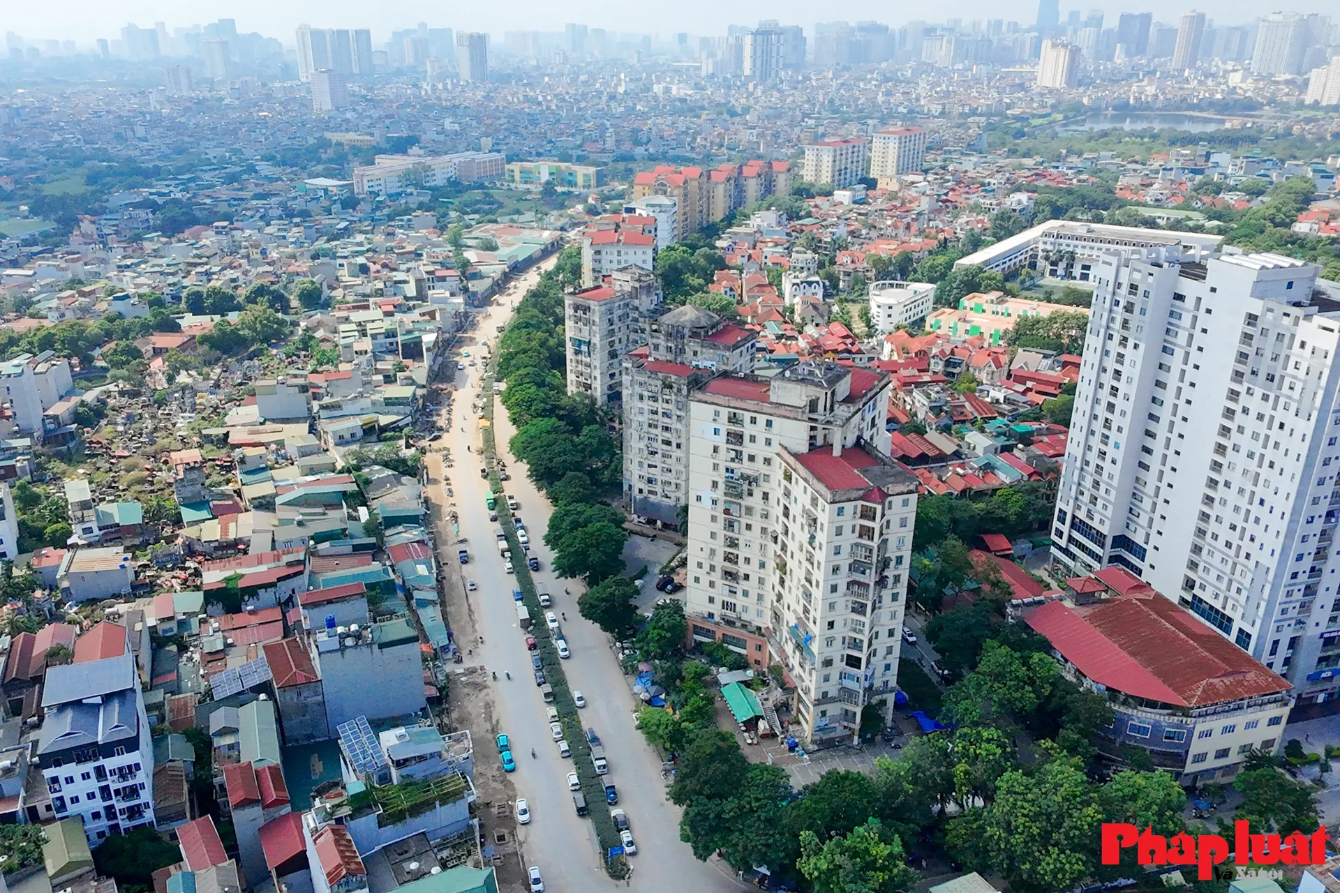 Đoạn đường vành đai 2,5 đang thi công nhìn từ đường Trịnh Đình Cửu thẳng tới đoạn giao với hầm chui Kim Đồng, Giải Phóng.