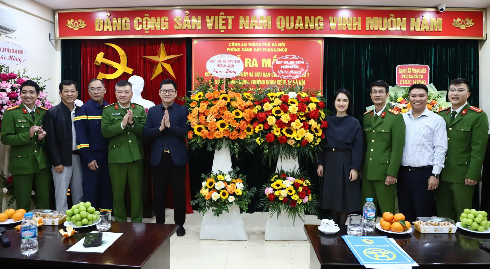 Lãnh đạo phường Hoàn Kiếm và phường Cửa Nam tặng hoa chúc mừng Đội Chữa cháy và Cứu nạn cứu hộ khu vực số 7.