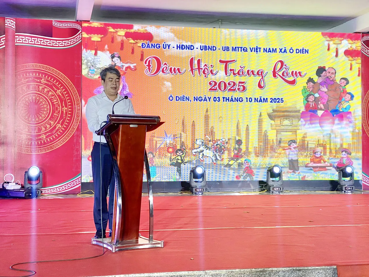 Chủ tịch UBND xã Ô Diên Đỗ Chí Hưng nhấn mạnh, Trung thu năm 2025 có ý nghĩa vô cùng đặc biệt, là Trung thu đầu tiên trên địa bàn xã Ô Diên kể từ khi chính thức vận hành mô hình chính quyền địa phương hai cấp. Với phương châm “gần dân, sát dân, nâng cao chất lượng phục vụ Nhân dân”, cấp ủy, chính quyền xã cùng các ban, ngành, đoàn thể đã dành nhiều tâm huyết để tổ chức chương trình “Đêm hội trăng rằm” giàu ý nghĩa với mong muốn toàn hệ thống chính trị quan tâm, chia sẻ và động viên thiếu niên, nhi đồng, để tất cả các em đều được đón một Trung thu trọn vẹn, ấm áp, để không ai bị bỏ lại phía sau.