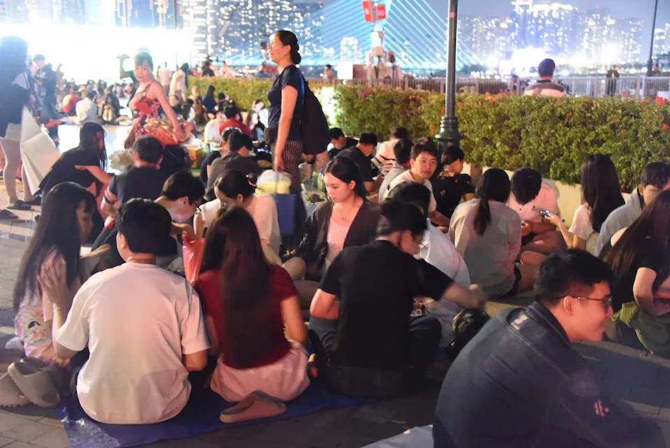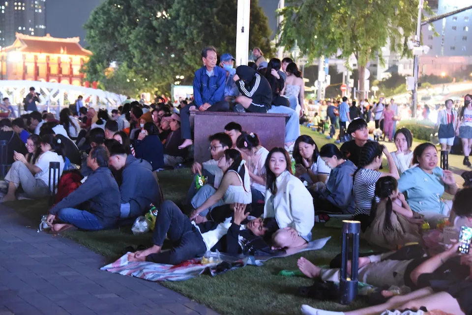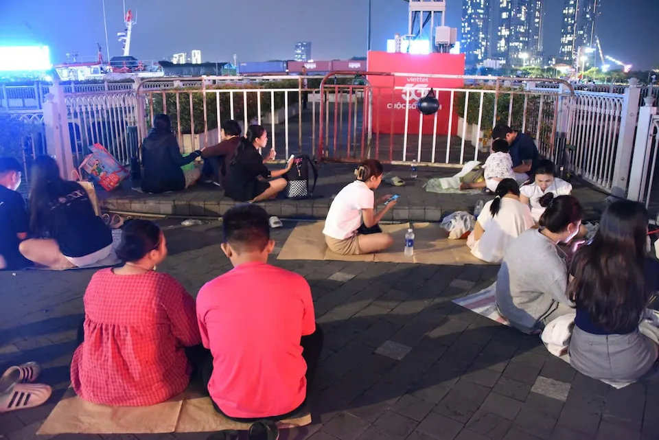Ngay từ sớm, các khu vực như phố đi bộ Nguyễn Huệ và công viên bến Bạch Đằng đã trở nên đông nghẹt. Tại công viên bến Bạch Đằng, nhiều gia đình và nhóm bạn trẻ đã mang theo bạt picnic, ngồi trò chuyện vui vẻ trong khi chờ đợi màn pháo hoa tầm cao sẽ được bắn lên tại khu vực đầu đường hầm sông Sài Gòn.