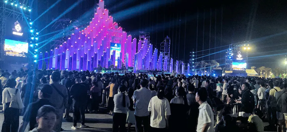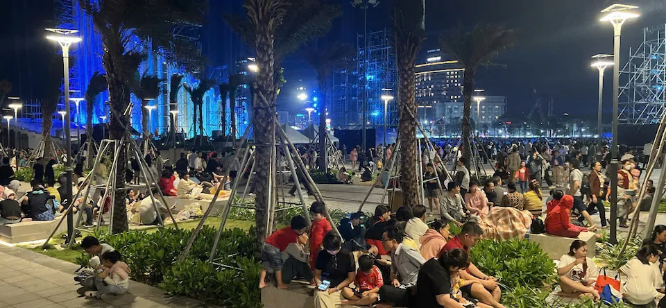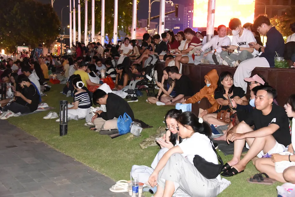 Không chỉ ở khu vực lõi trung tâm, bầu không khí tại Quảng trường Tam Thắng cũng trở nên "hầm hập" và cuồng nhiệt hơn bao giờ hết nhờ sự xuất hiện của hàng nghìn người dân đổ về đây từ sớm1. Dù thời tiết đêm giao thừa khá lý tưởng và mát mẻ với mức nhiệt khoảng 24 độ C, nhưng sức nóng từ dòng người náo nức chờ đợi màn pháo hoa tầm cao đã làm bùng nổ không gian nơi đây.
