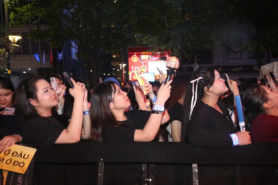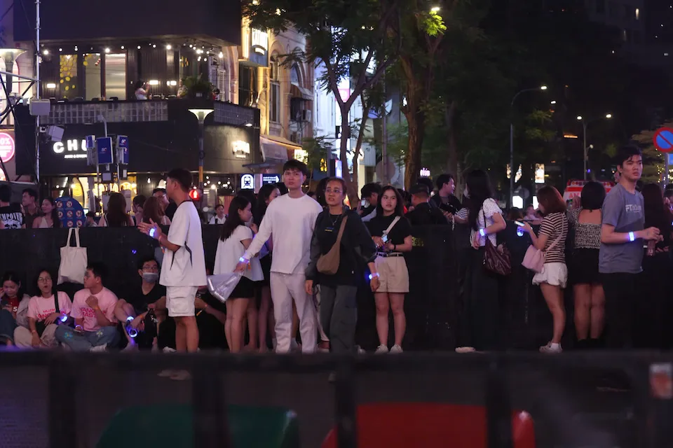 Tại phố đi bộ Nguyễn Huệ, không khí càng thêm bùng nổ với âm nhạc sôi động từ sân khấu countdown. Đến khoảng 19 giờ 30, đoạn đường dài hơn 500m tại đây gần như không còn chỗ trống. Để đảm bảo trật tự, lực lượng chức năng đã dựng hàng rào an ninh và chia khu vực này thành nhiều phân khu nhằm hạn chế tình trạng ùn ứ so với các năm trước.