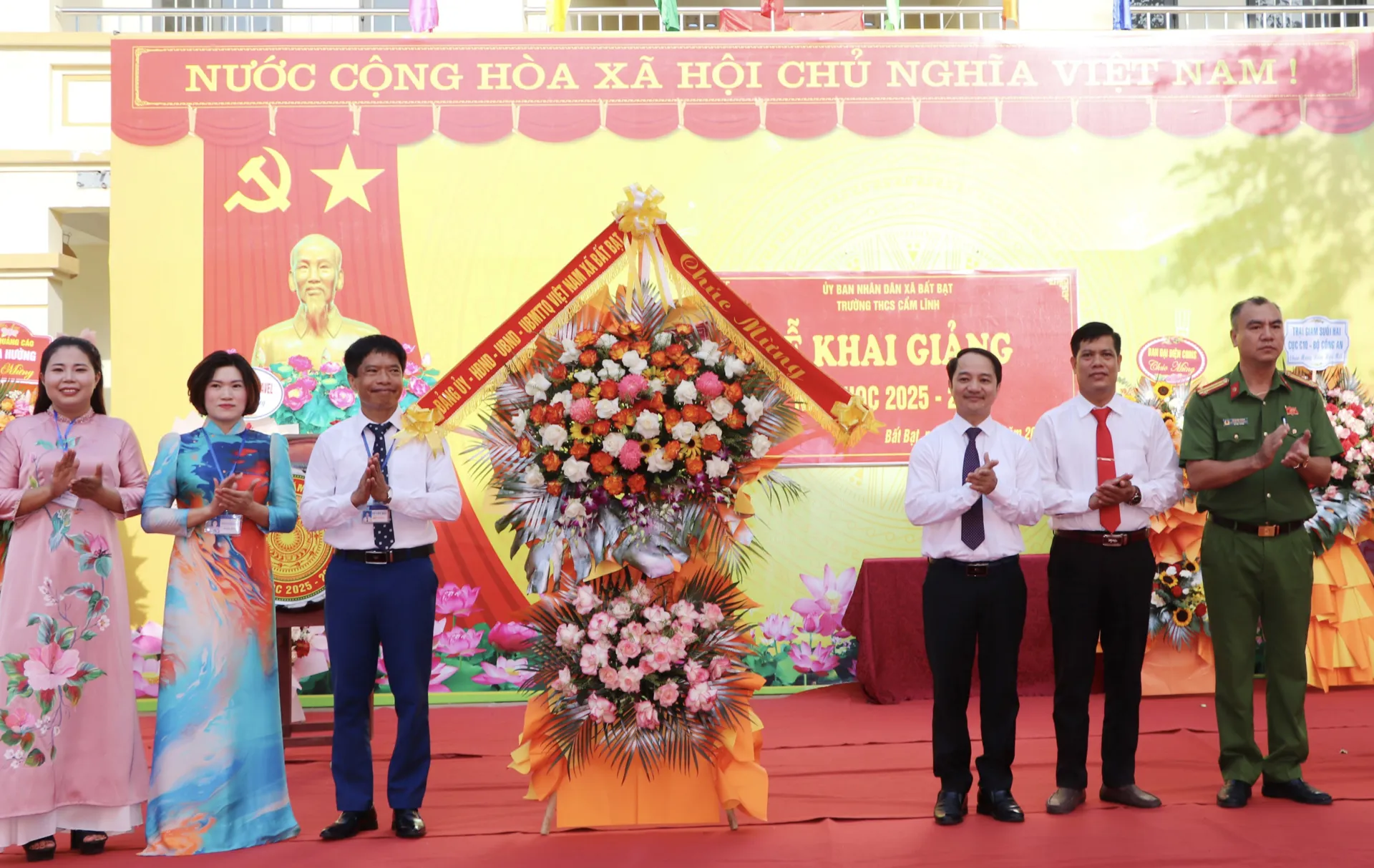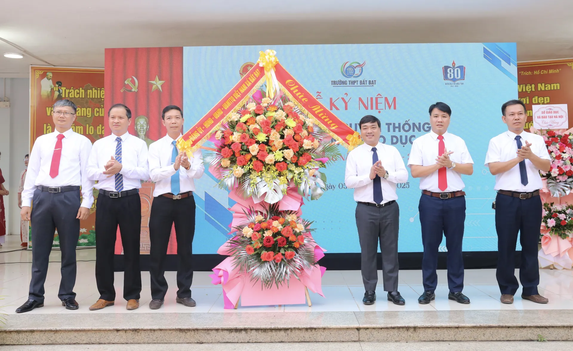 Chủ tịch UBND xã Bất Bạt Nguyễn Ngọc Tú dự và tặng hoa chúc mừng tại Trường THPT Bất Bạt.