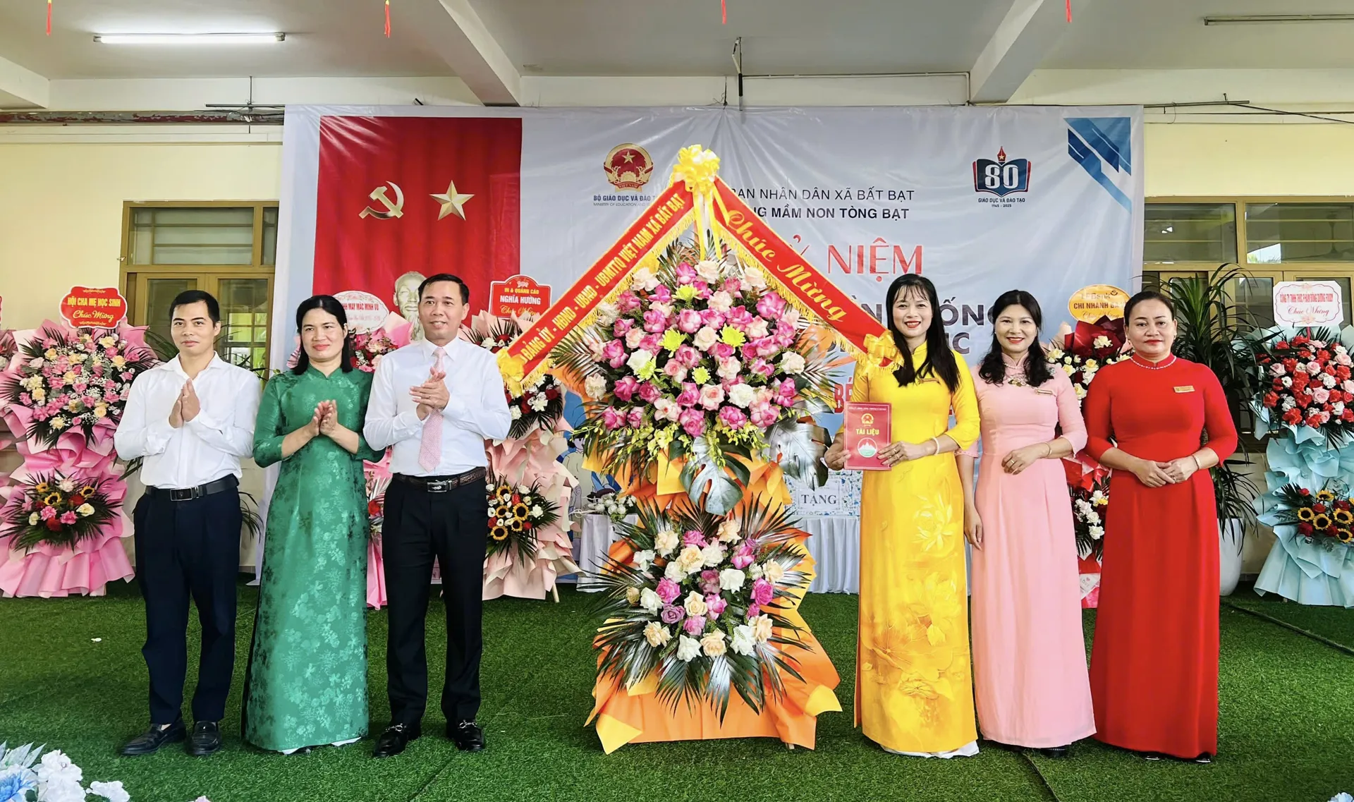 Phó Chủ tịch UBND xã Bất Bạt Nguyễn Việt Giao dự và tặng hoa Trường Mần non Tòng Bạt.