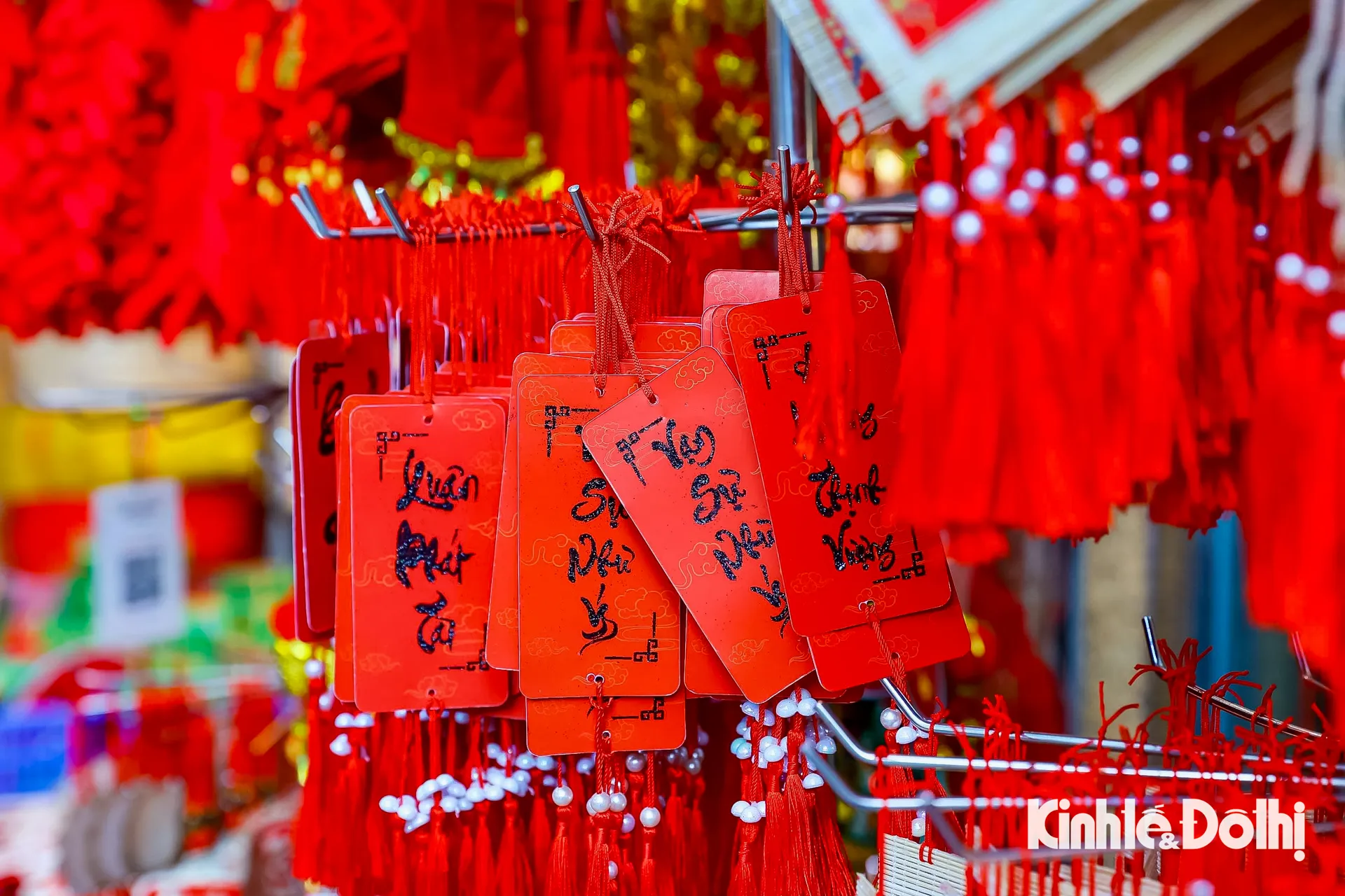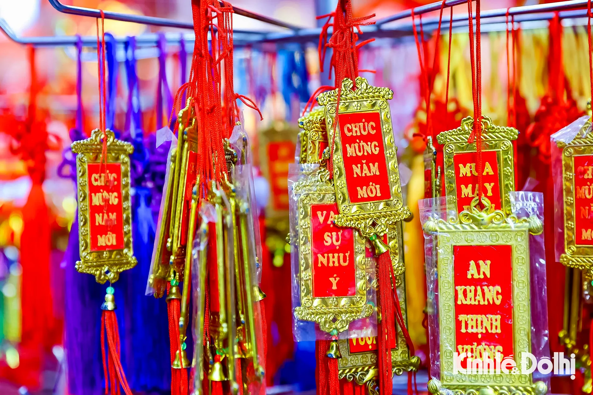 Những dây treo may mắn, câu chúc đầu năm được bày bán san sát, thu hút sự quan tâm của người mua.