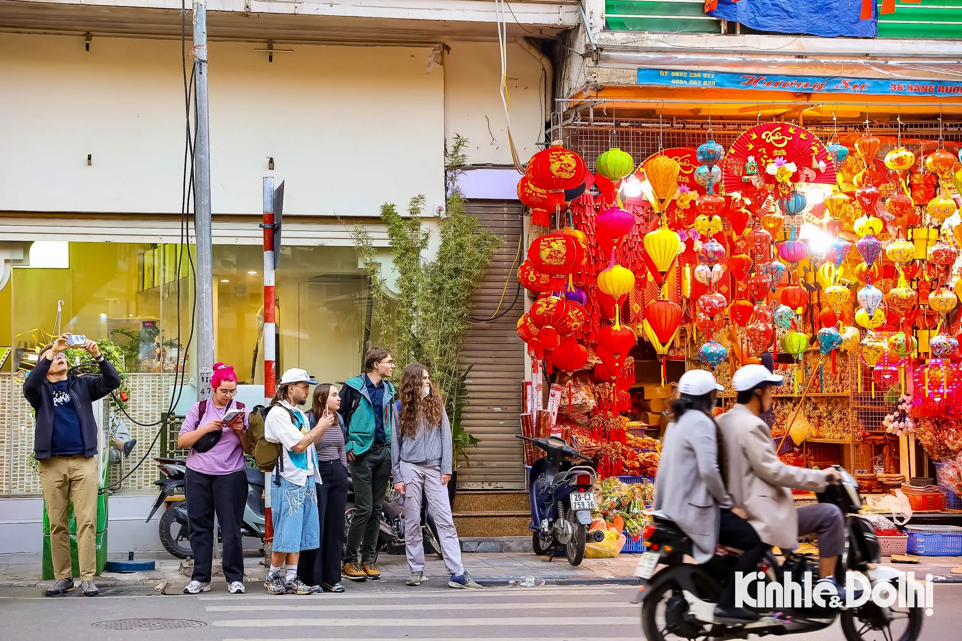Du khách quốc tế thích thú chụp ảnh, tìm hiểu văn hóa Tết Việt thông qua những vật phẩm truyền thống bày bán trên phố Hàng Mã.