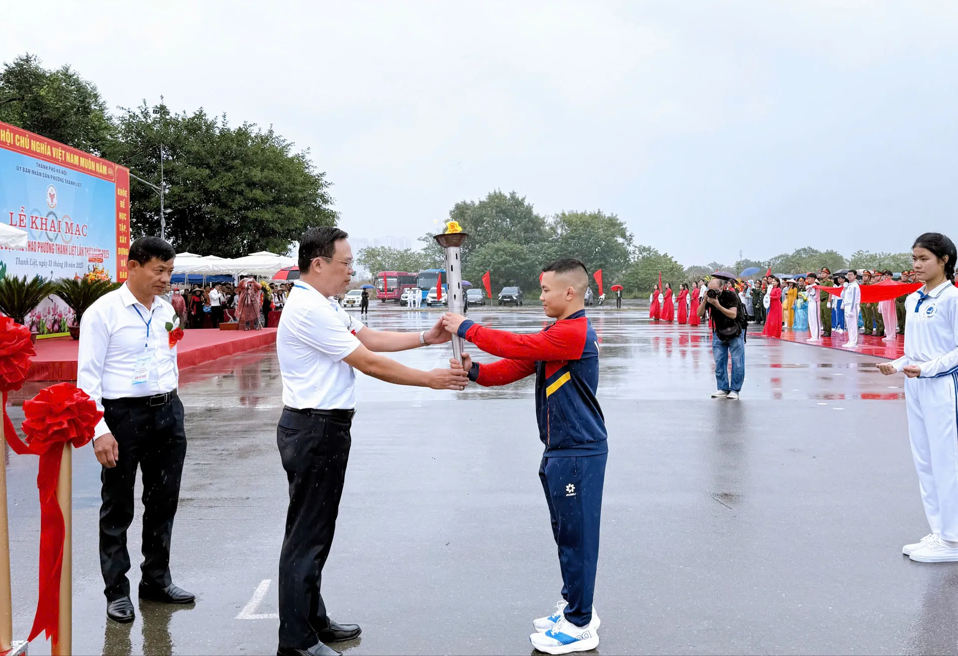 Bí thư Đảng ủy, Chủ tịch HĐND phường Thanh Liệt Nguyễn Minh Tuân đón nhận ngọn đuốc để thắp lên đài lửa truyền thống.