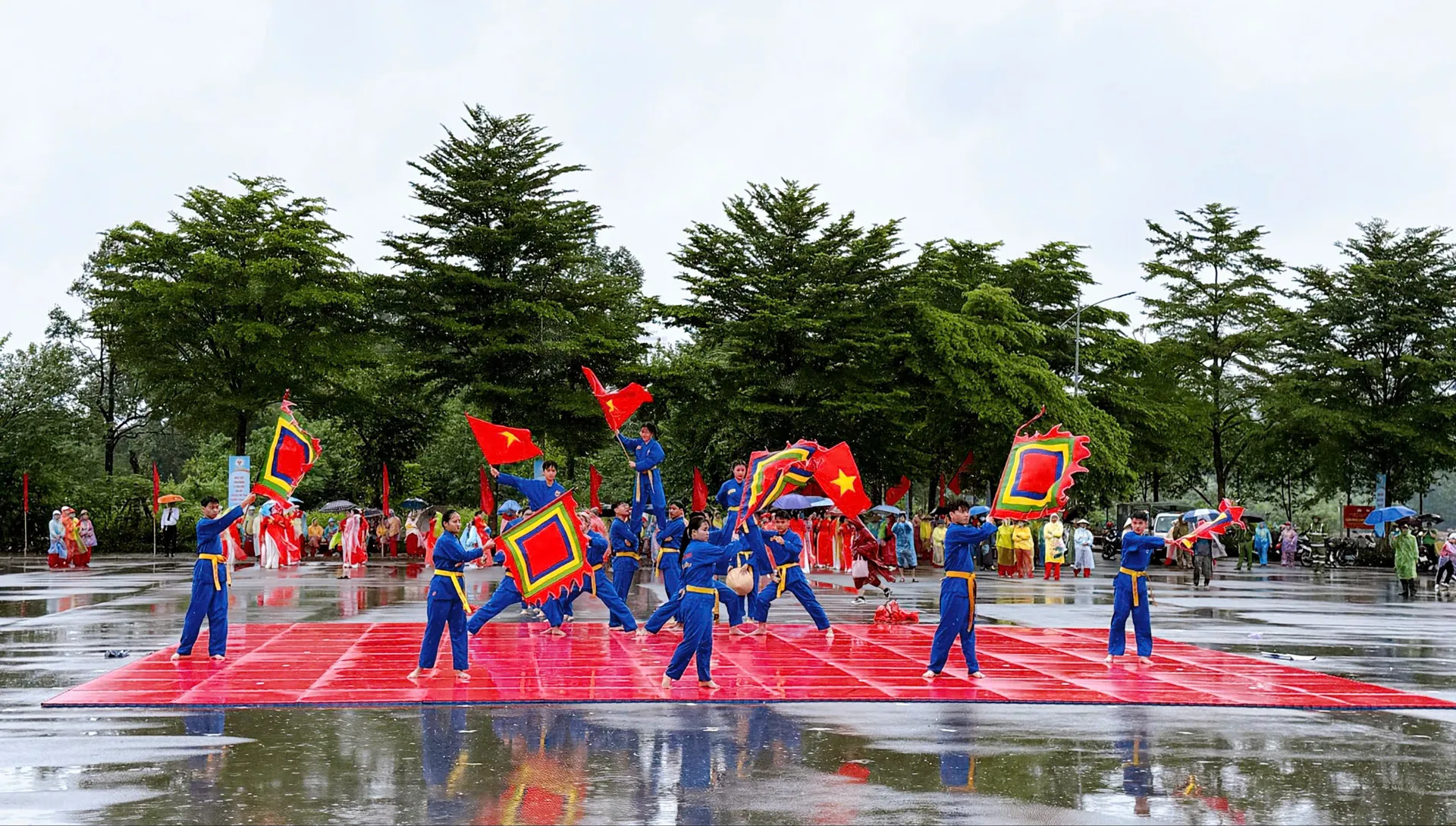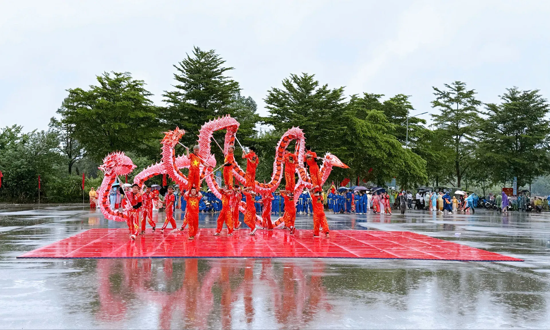 Ngay từ sáng sớm, dù trời mưa nhẹ, Quảng trường Đô hồ Đại vương Phạm Tu vẫn ngập tràn sắc đỏ rực rỡ của cờ hoa, băng rôn, khẩu hiệu. Tiếng nhạc vang lên rộn rã, hòa cùng không khí tưng bừng của dòng người nô nức đổ về dự hội, tạo không khí sôi động, háo hức.