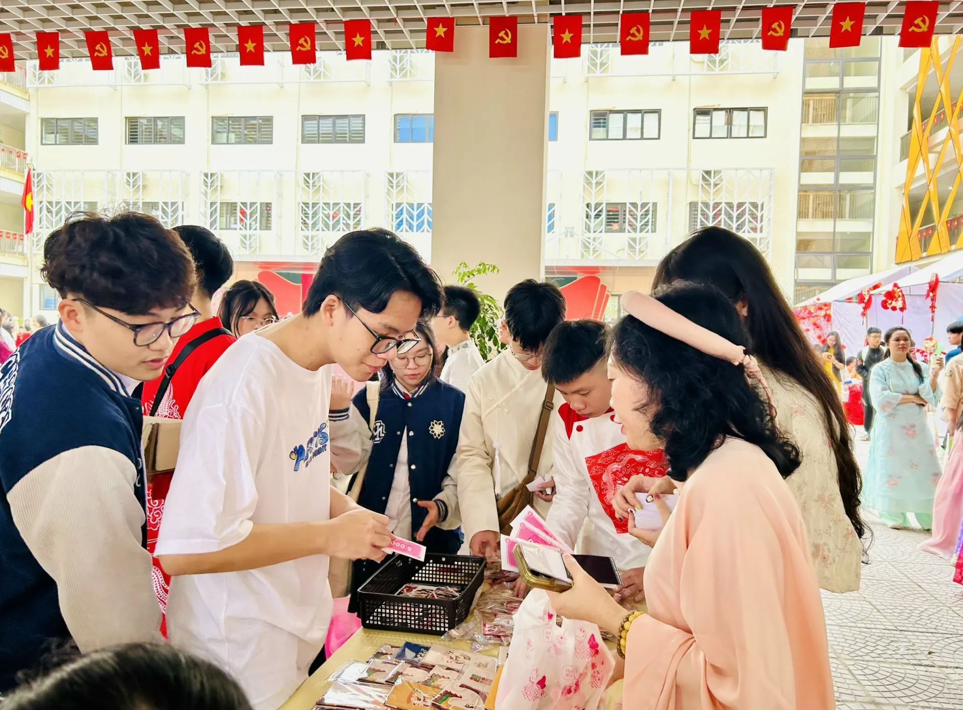 Chương trình “Sắc xuân Hoàng Mai 2026” thu hút đông đảo học sinh hào hứng tham gia các hoạt động như Hội chợ Xuân, gói bánh chưng; thi viết câu đối, câu chúc Tết; trang trí mâm ngũ quả.