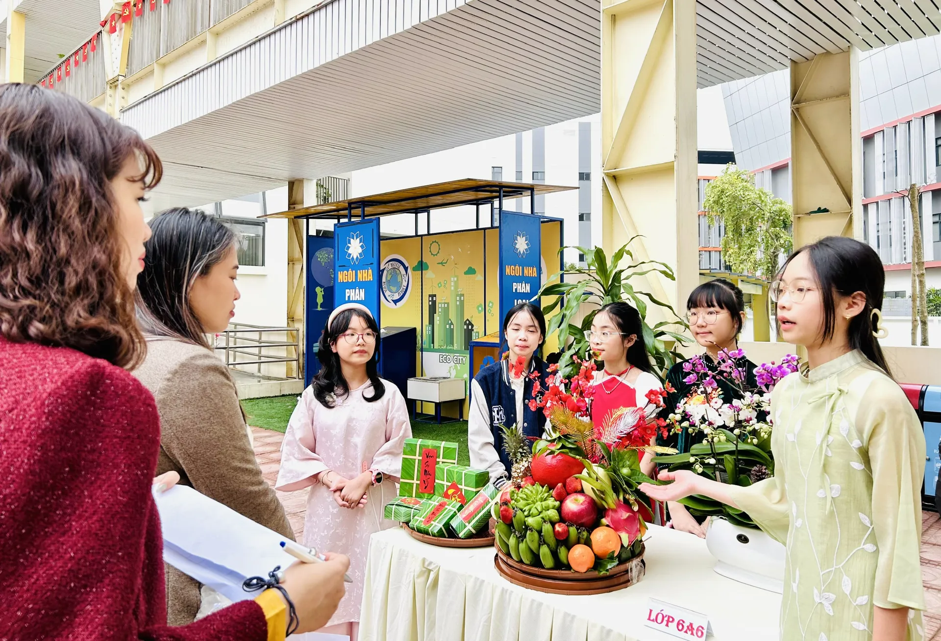 Các em học sinh lớp 6 thi trưng bày mâm ngũ quả có sự giúp sức của bố mẹ mua nguyên liệu. Các em bày mâm quả đầy đủ ít nhất 5 loại quả, kết hợp với trang trí lọ hoa, câu đối... để mâm quả được hài hòa, đặc sắc, dâng lên cúng tổ tiên với hy vọng năm mới nhiều may mắn, thành công.