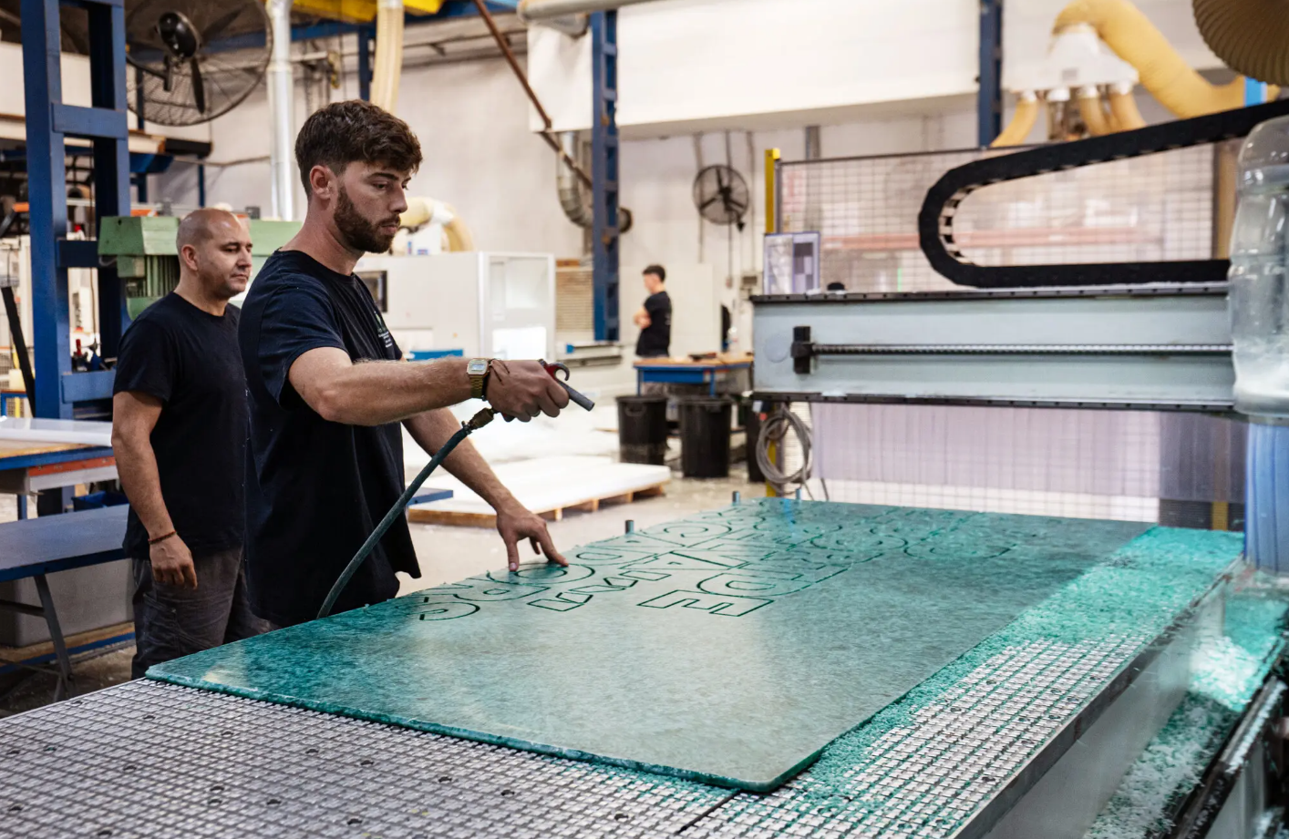 Công đoạn gia công panel nhựa từ lưới đánh cá tái chế, bước cuối trước khi vật liệu này được đưa vào sản xuất nội thất và ghế ngồi cho không gian công cộng.