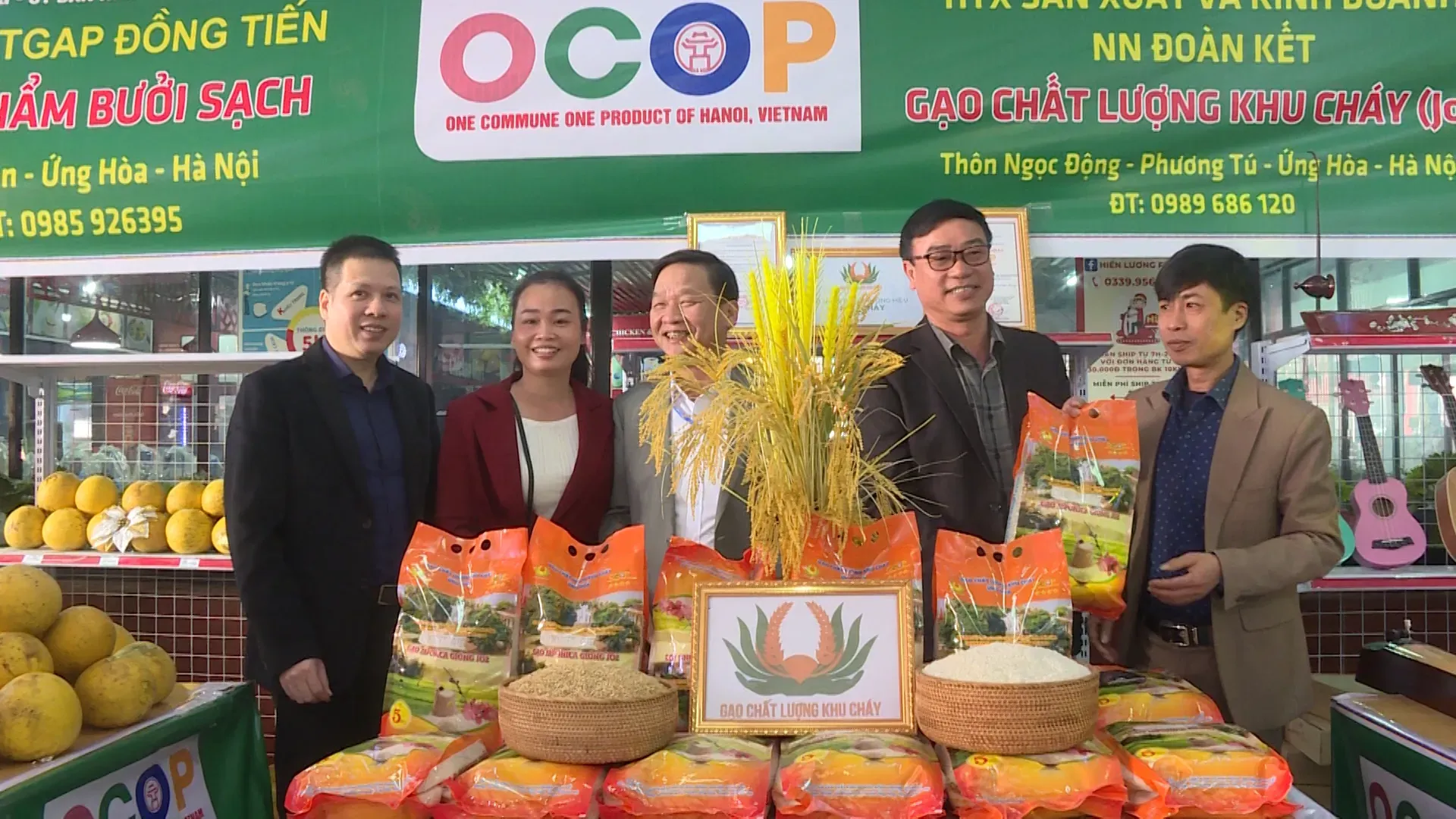 Gạo chất lượng cao Khu Cháy của Hợp tác xã Sản xuất, kinh doanh dịch vụ nông nghiệp Đoàn Kết (xã Ứng Hòa, TP Hà Nội) được quảng bá tại nhiều hội chợ. Ảnh: Tùng Nguyễn