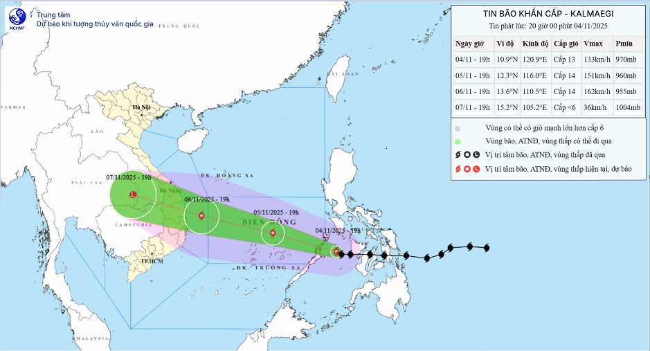 Kinhtedothi – Tối 4/11, theo bản tin khẩn cấp mới nhất từ Trung tâm Dự báo Khí tượng Thủy văn Quốc gia, chỉ vài giờ sau khi đi vào vùng biển phía Tây Philippines, bão Kalmaegi đã và đang tiếp tục mạnh lên một cách đáng lo ngại, hướng thẳng vào Biển Đông và được dự báo sẽ ảnh hưởng trực tiếp đến các tỉnh Miền Trung Việt Nam từ chiều tối ngày 6/11.
