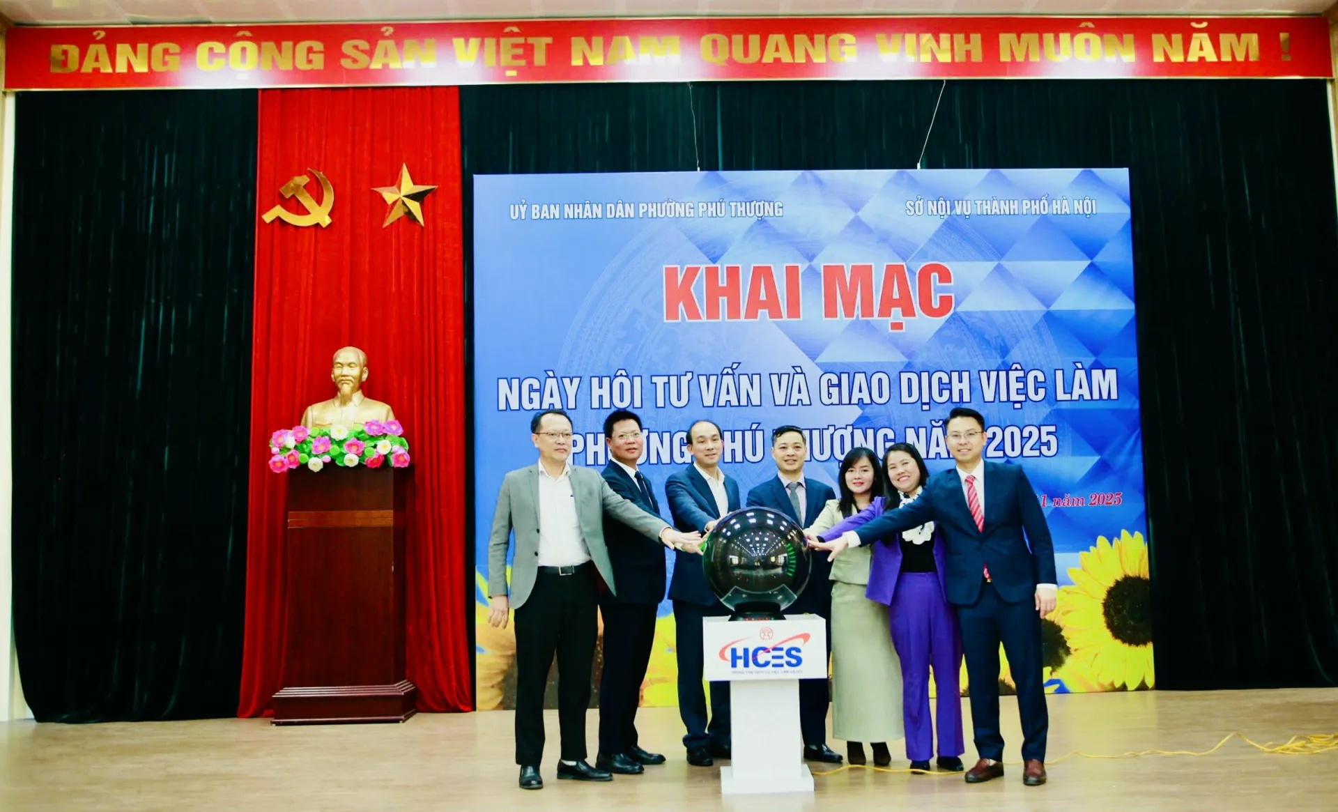 Các đại biểu bấm chuông khai mạc Ngày hội Tư vấn và Giao dịch việc làm phường Phú Thượng năm 2025.