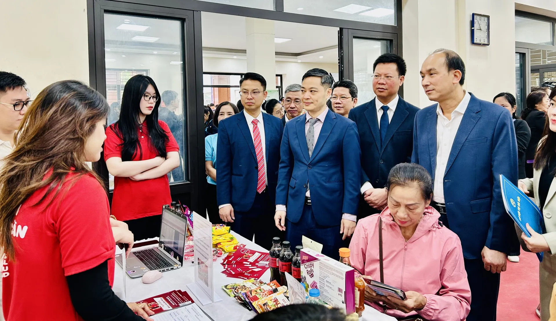Lãnh đạo Sở Nội vụ Hà Nội, phường Phú Thượng thăm hỏi các DN, đơn vị tham gia tuyển dụng, tuyển sinh và người lao động tại Ngày hội Tư vấn và Giao dịch việc làm phường Phú Thượng năm 2025. Ảnh: Trần Oanh
