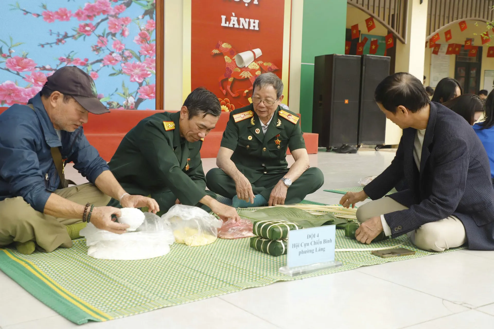 Hội Cựu chiến binh phường Láng tham gia thi gói bánh chưng.
