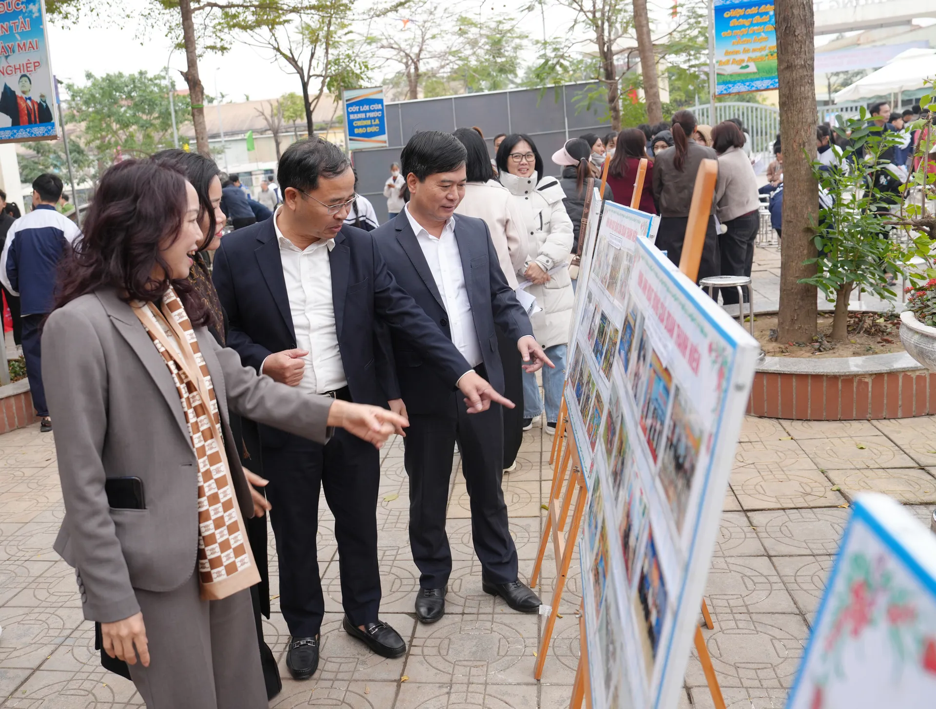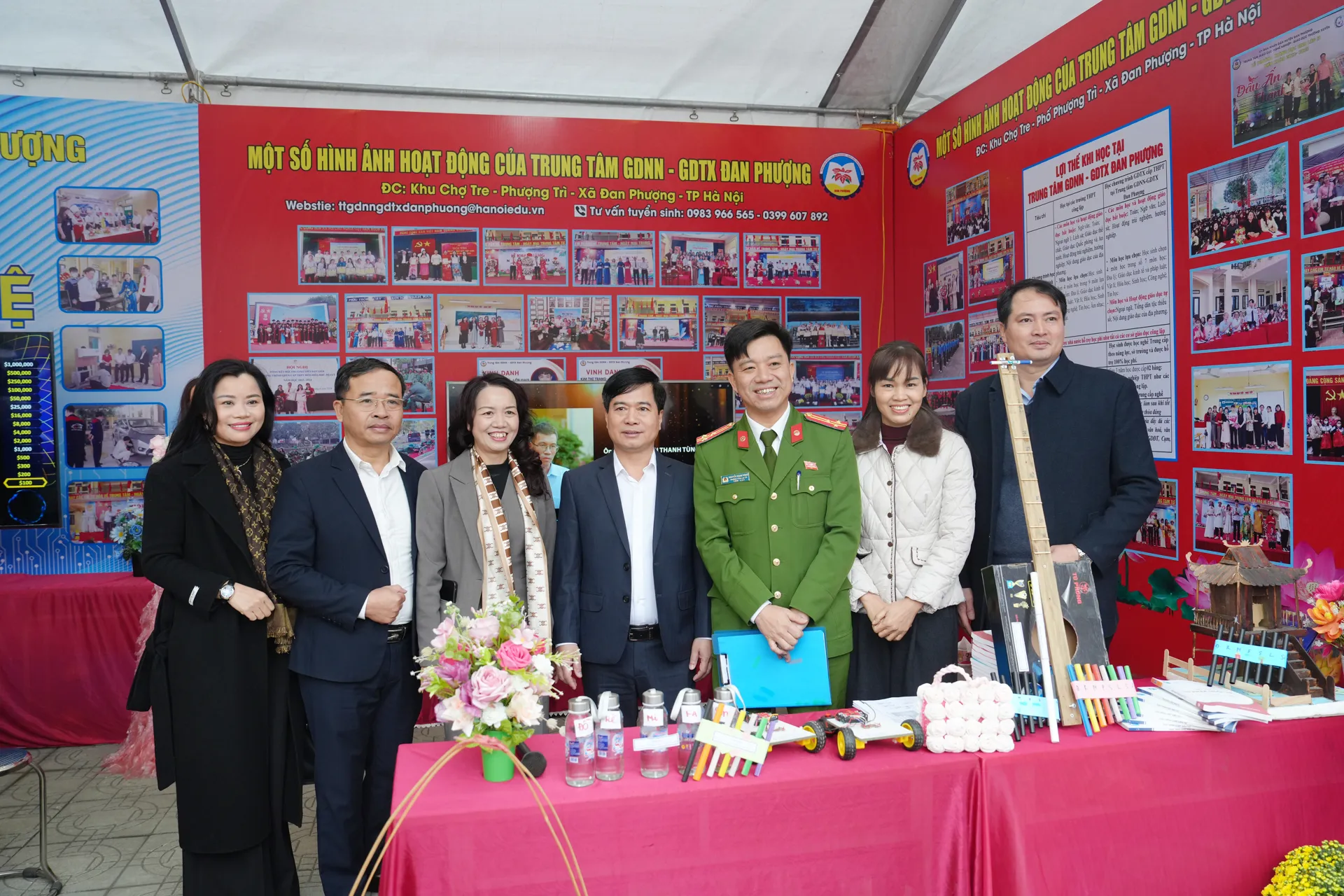 Đại diện Sở GD&ĐT và lãnh đạo xã Ô Diên tham quan các gian trưng bày tại Ngày hội.