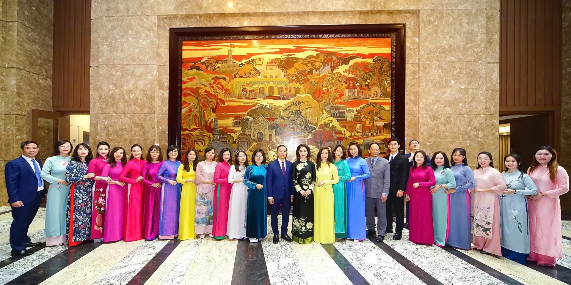 Bức tranh “Thăng Long hội tụ” - tác phẩm sơn mài được trưng bày tại Thành ủy Hà Nội, thực hiện bởi nghệ nhân Đỗ Hùng Chiêu và đội ngũ họa sĩ.