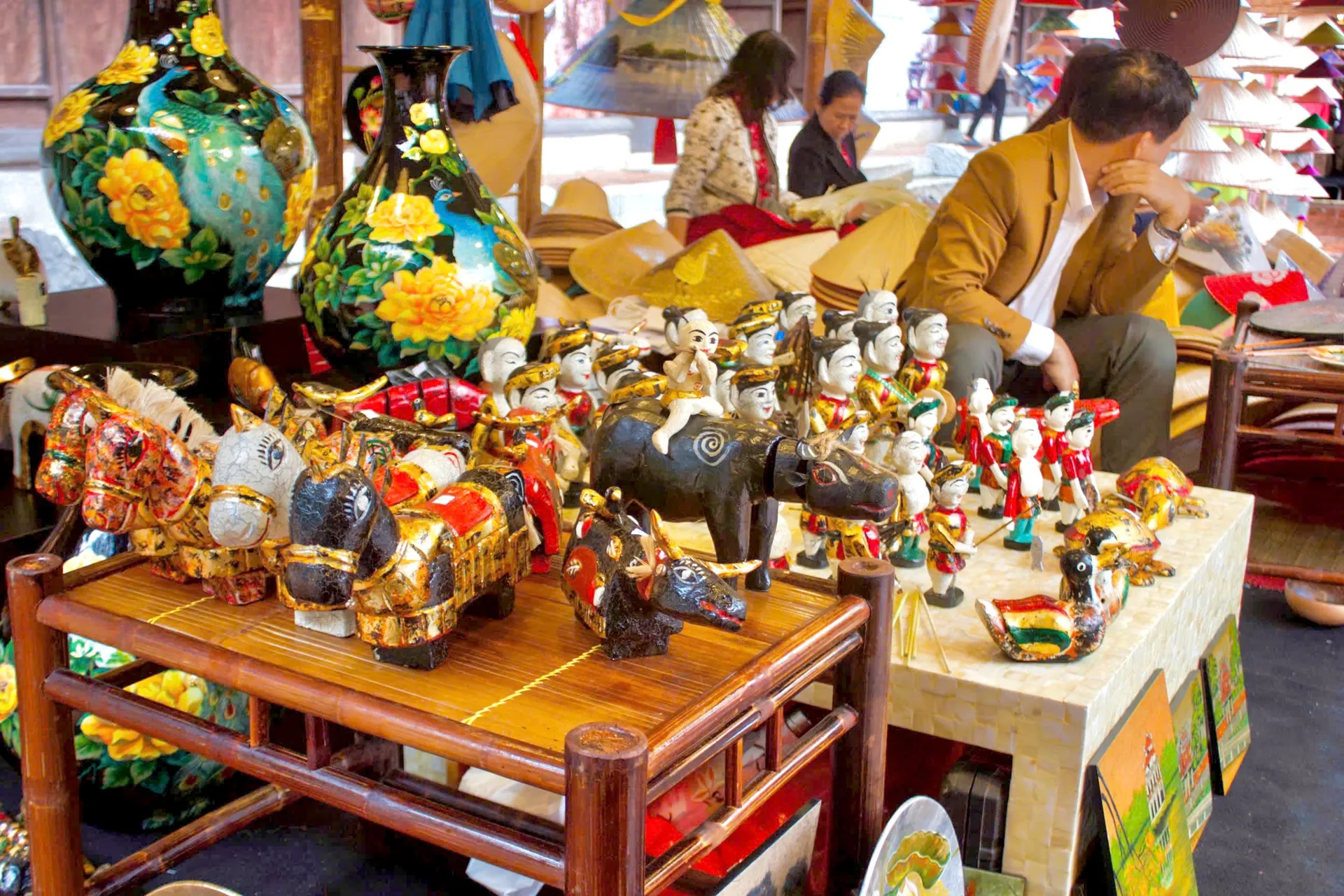 Các sản phẩm sơn mài Hạ Thái với sắc màu rực rỡ, họa tiết tinh xảo tái hiện hình ảnh làng quê và danh thắng Hà Nội. Ảnh: Thu Trang