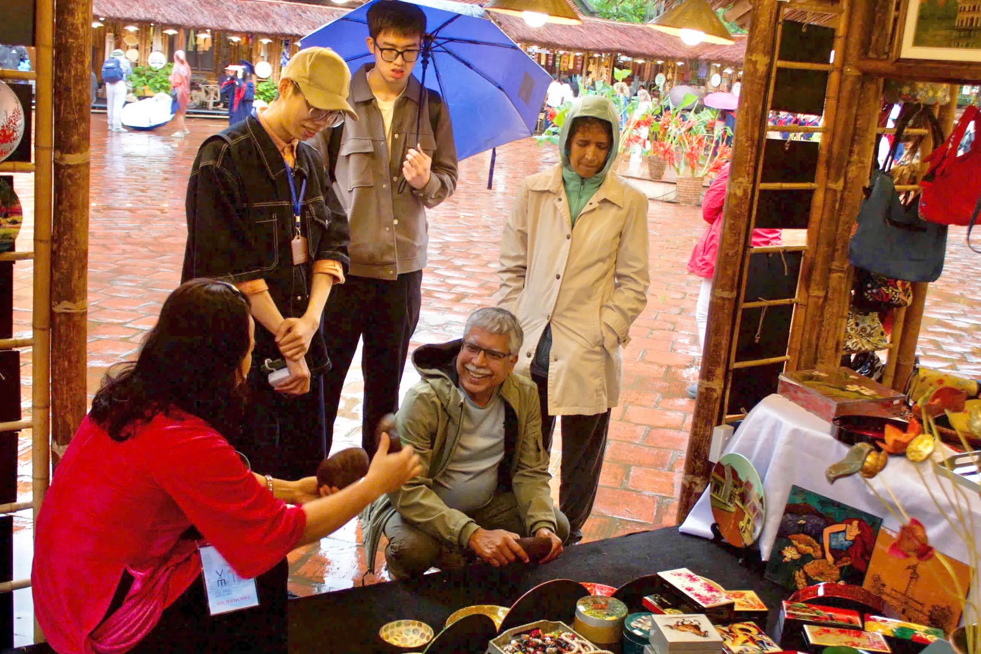 Nghệ nhân giới thiệu sản phẩm của làng sơn mài Hạ Thái tới du khách quốc tế. Ảnh: Thu Trang