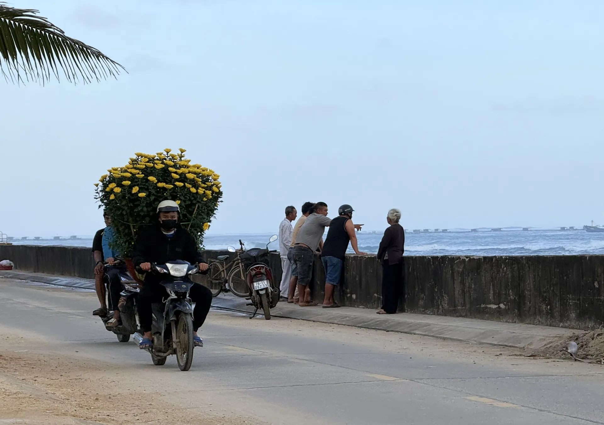 Càng về chiều, biển càng trở nên dữ dội hơn. Từng đợt sóng lớn tung bọt trắng xóa, đập mạnh vào bờ. Thỉnh thoảng lại có nhóm người tụ tập trên bờ kè, vừa nhìn biển vừa trò chuyện về cái Tết sắp tới, về những món ăn quen thuộc, về những trận đua thuyền truyền thống tứ linh dịp đầu năm mới.
