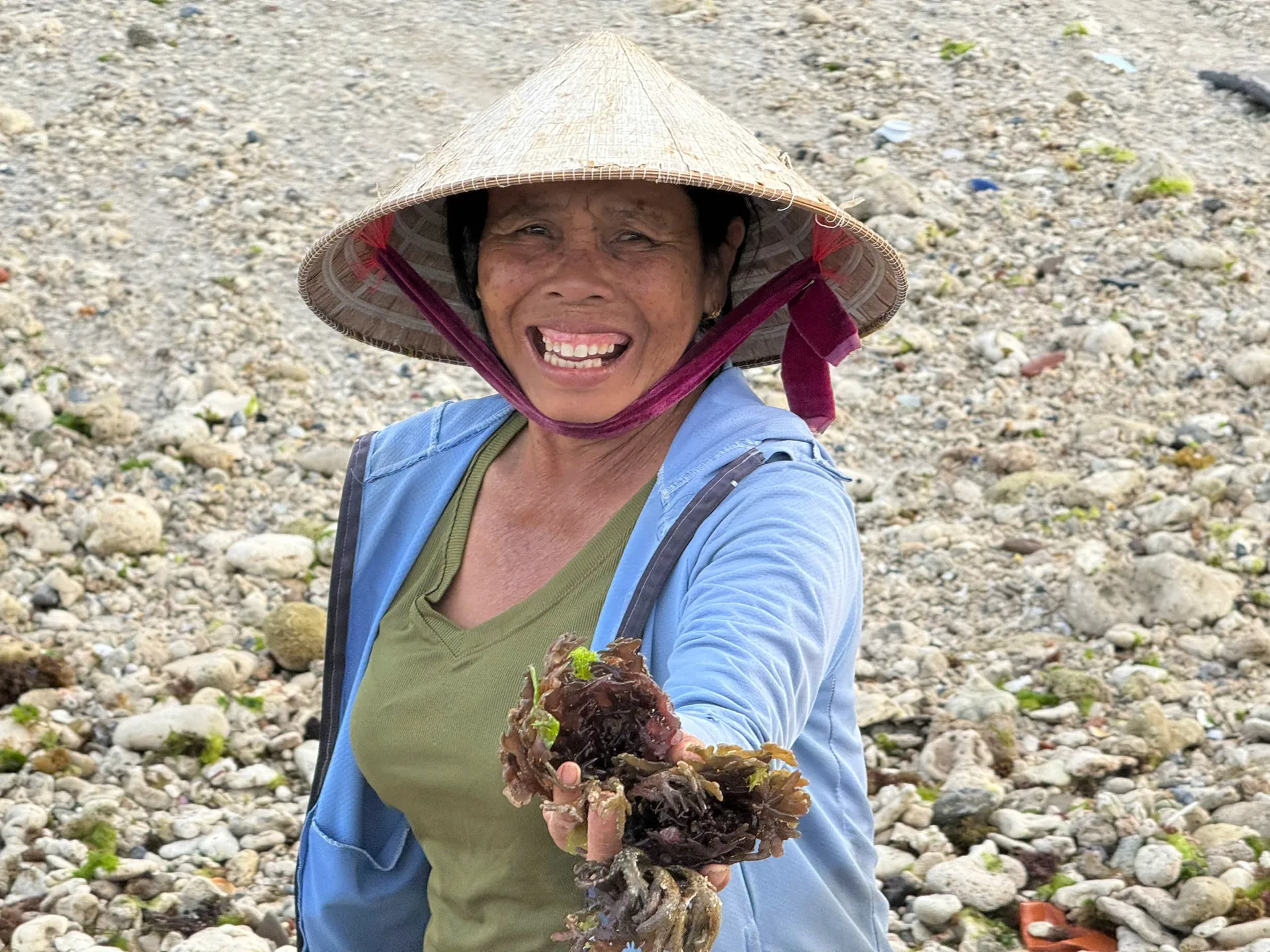Cụ bà khoe mớ rong chân vịt vừa nhặt được ở bờ biển.