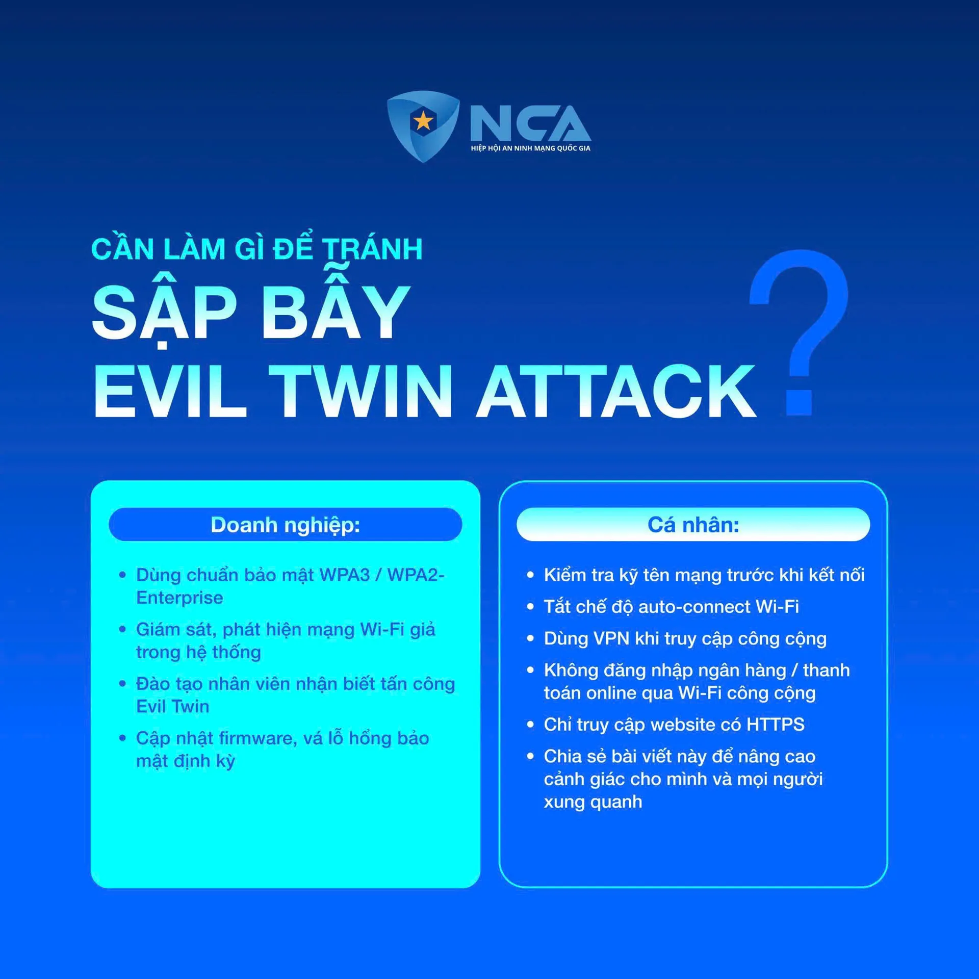 Theo Hiệp hội An ninh mạng Quốc gia (NCA), Evil Twin là hình thức tấn công mà tin tặc dựng lên một điểm truy cập giả mạo giống hệt mạng thật, từ tên cho đến giao diện. Khi người dùng vô tình “bắt sóng nhầm”, hacker có thể ngắt mạng thật, điều hướng truy cập và ghi lại toàn bộ dữ liệu truyền tải: từ tài khoản ngân hàng, email, mạng xã hội đến mật khẩu và thông tin cá nhân. Nguy hiểm hơn, kẻ xấu có thể cài mã độc, chiếm quyền điều khiển thiết bị hoặc âm thầm nghe lén giao dịch trực tuyến.