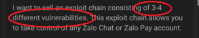 Trên diễn đàn trao đổi dữ liệu của hacker tên Raid***, một tài khoản mới lập vào tháng 8/2021 mang tên ilovevng đã đăng bài chào bán lỗ hổng 0-day (Zero day) giúp chiếm quyền kiểm soát bất kỳ tài khoản Zalo Chat hay Zalo Pay nào.