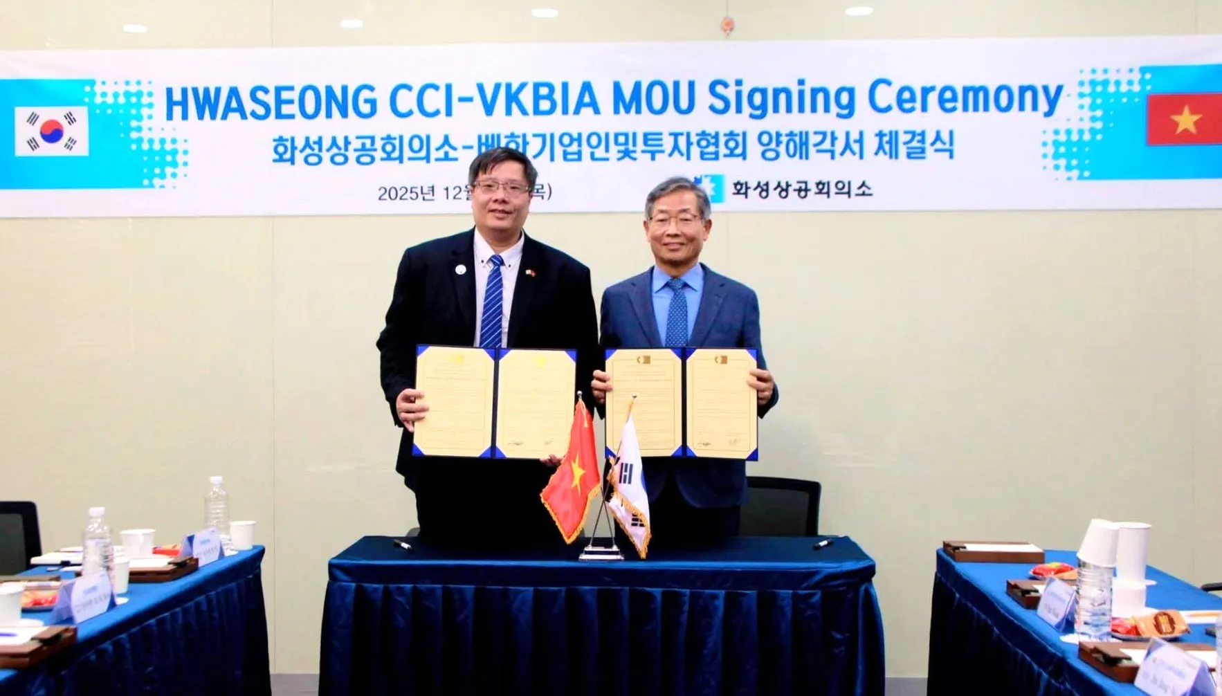 Hiệp hội Doanh nhân và Đầu tư Việt Nam-Hàn Quốc (VKBIA) và Liên đoàn Thương mại và Công nghiệp thành phố Hwaseong (HCCI) ký kết Biên bản ghi nhớ hợp tác (MoU) chiến lược toàn diện, ngày 11/12, tại thành phố Hwaseong (Hàn Quốc).
