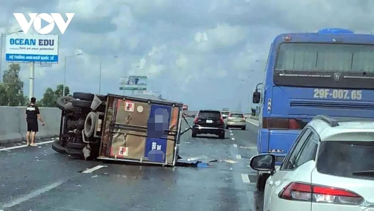Xe tải lật ngang trên cao tốc Hà Nội - Hải Phòng
