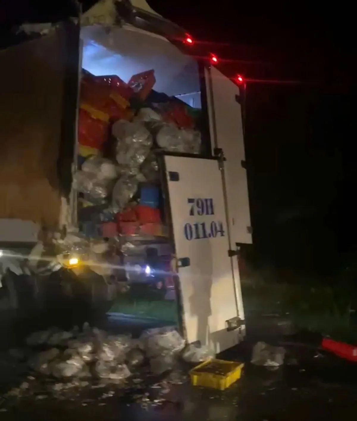 Thời điểm trên, xe đầu kéo mang BKS 50H-903.40 lưu thông theo hướng Nam - Bắc thì xảy ra va chạm với xe tải thùng đông lạnh mang BKS 79H-011.04 phía trước cùng chiều. Cú va chạm mạnh khiến thùng đông lạnh bị rách toạc, nắp thùng bị gãy, rơi ra ngoài.