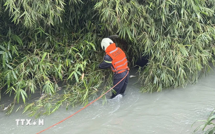 Lực lượng chức năng tỉnh Đồng Nai tìm kiếm chiếc ô tô bị nước cuốn trôi tại khu vực cầu Lộc Lâm. Ảnh: Lê Xuân/TTXVN