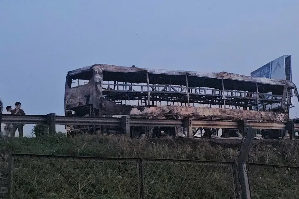 Hiện trường vụ xe khách cháy rụi giữa cao tốc.