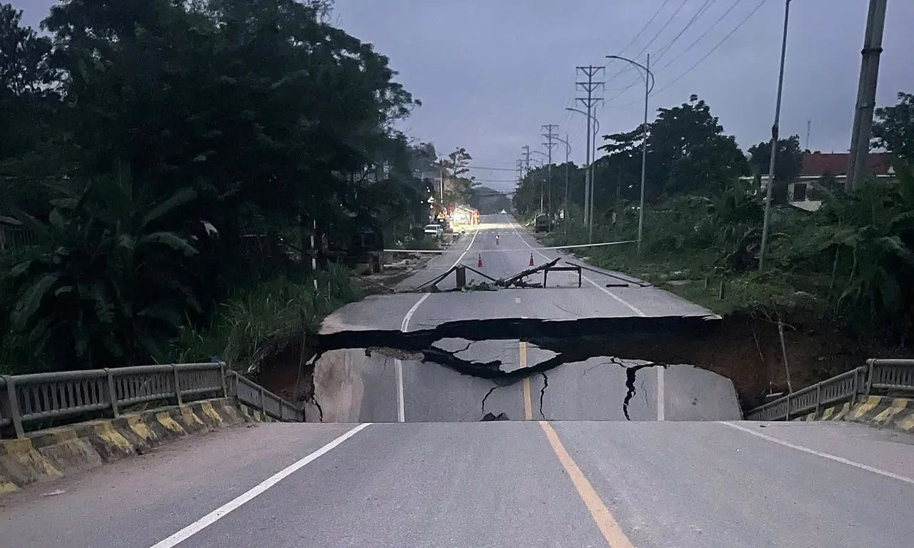 Một phía đường dẫn lên cầu Tát Luông bị sụt lún trong đêm 2/10. Ảnh: CTV.