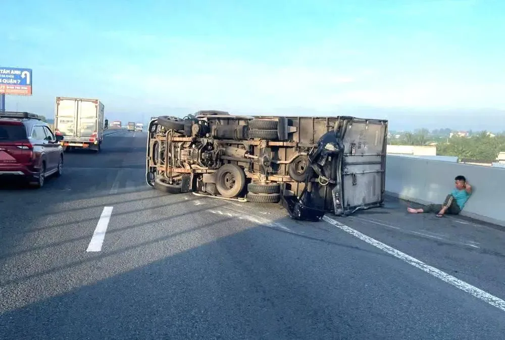 Xe tải bị lật ngang nằm dọc theo cao tốc. Ảnh: VT
