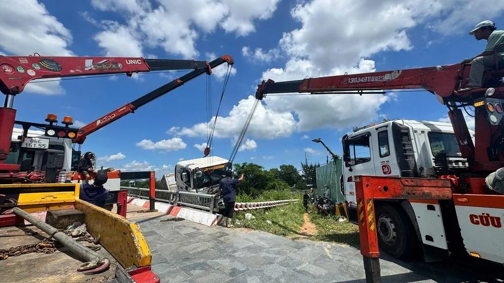 Tại hiện trường, phần đuôi xe tải kẹt lại trên thành bê tông của cầu, phần đầu xe cắm xuống sông. Rất may vụ việc không gây thương vong.