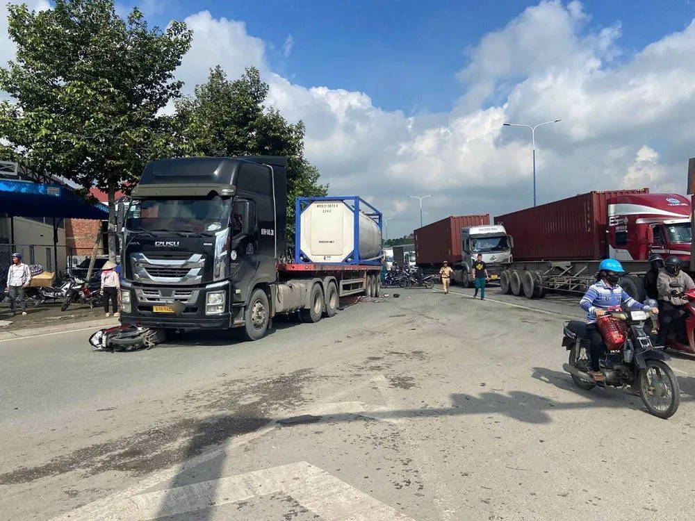 Khi đến giao lộ giao với quốc lộ 1K (phường Tân Đông Hiệp, TP Hồ Chí Minh), tài xế điều khiển xe rẽ phải. Trong lúc ôm cua, xe đầu kéo va chạm với xe máy 61D2-089.XX chở theo ba người, gồm hai ông bà và cháu ngoại.