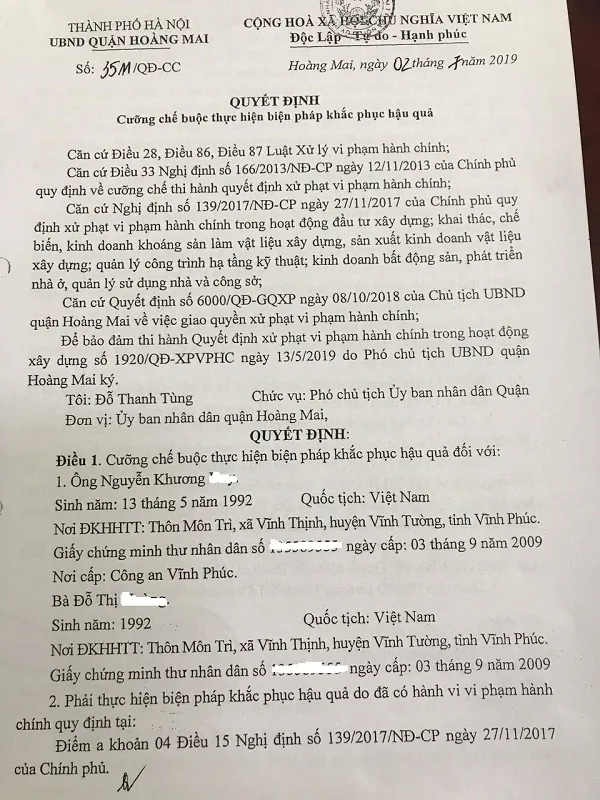 Để rộng đường dư luận, phóng viên đã liên hệ làm việc đại diện UBND quận Hoàng Mai được biết, vào đầu tháng 7/2019, đơn vị này đã ban hành 7 quyết định cưỡng chế buộc thực hiện biện pháp khắc phục hậu quả.