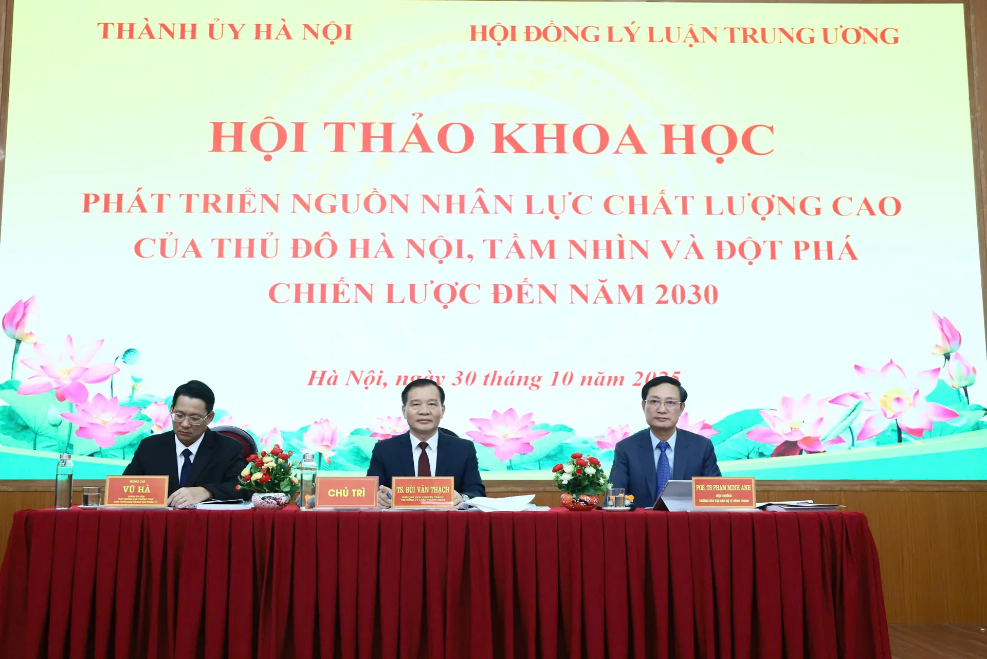 Kinhtedothi - Chiều 30/10, Thành ủy Hà Nội phối hợp với Hội đồng Lý luận Trung ương tổ chức Hội thảo khoa học cấp Thành phố năm 2025 với chủ đề “Phát triển nguồn nhân lực chất lượng cao của Thủ đô Hà Nội đến năm 2030, tầm nhìn và đột phá chiến lược” tại Trường Đào tạo cán bộ Lê Hồng Phong TP Hà Nội.