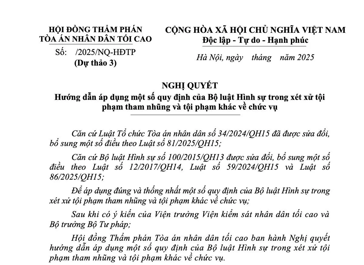 Dự thảo Nghị quyết của Hội đồng Thẩm phán TAND Tối cao hướng dẫn áp dụng một số quy định của Bộ luật Hình sự trong xét xử tội phạm tham nhũng và các tội phạm khác về chức vụ.