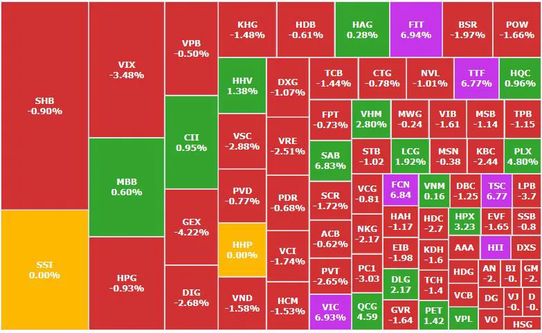 Trong nhóm dịch vụ tài chính, SSI đứng giá, trong khi VIX giảm 3,48% và VCI giảm 1,74%, phản ánh sự thận trọng của dòng tiền sau các biến động mạnh gần đây.