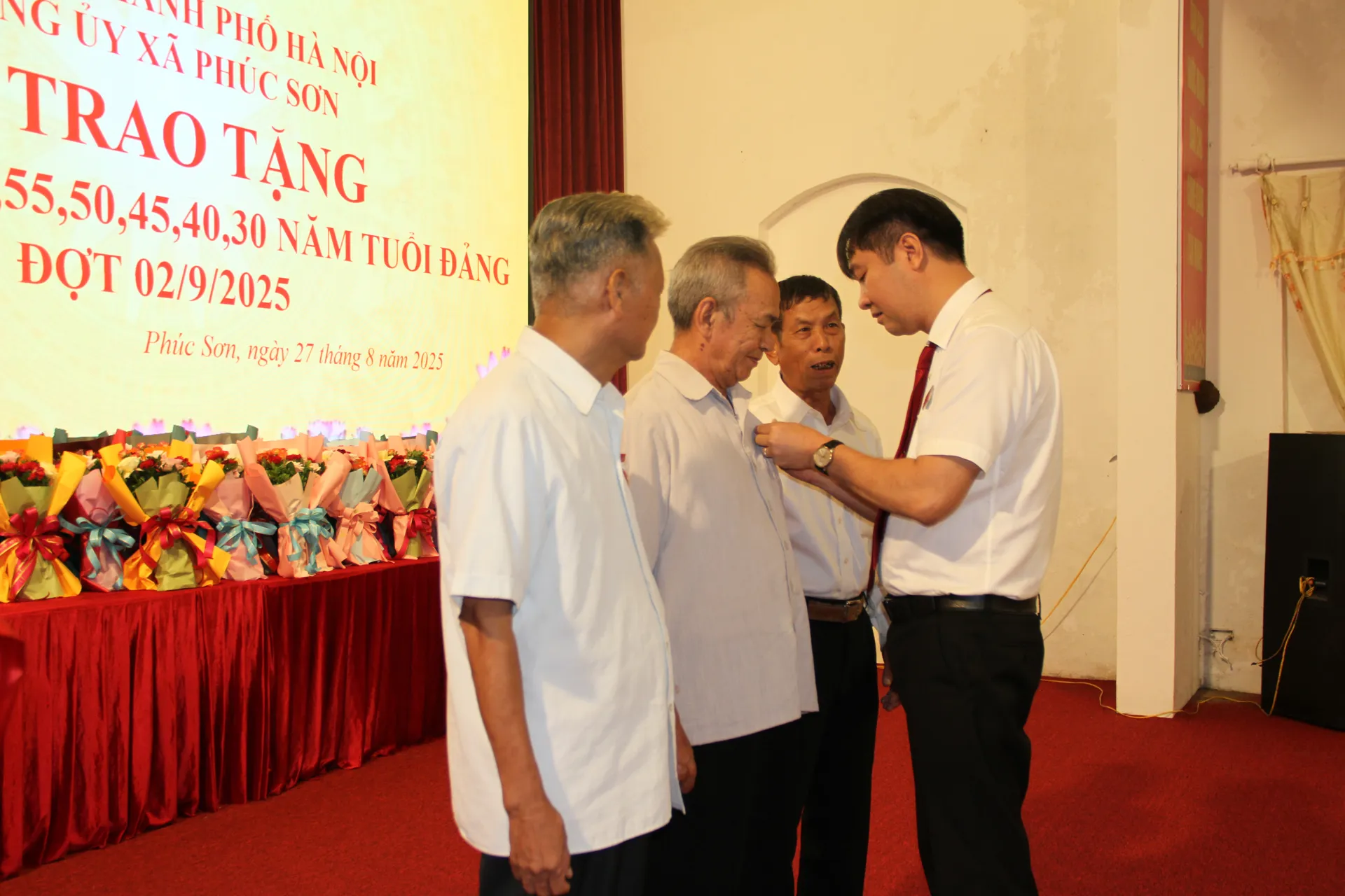 Phó Bí thư Thường trực Đảng ủy xã phúc Sơn Trần Việt Thắng gắn Huy hiệu 50 năm tuổi đảng cho các đảng viên. Ảnh: Biên Phạm
