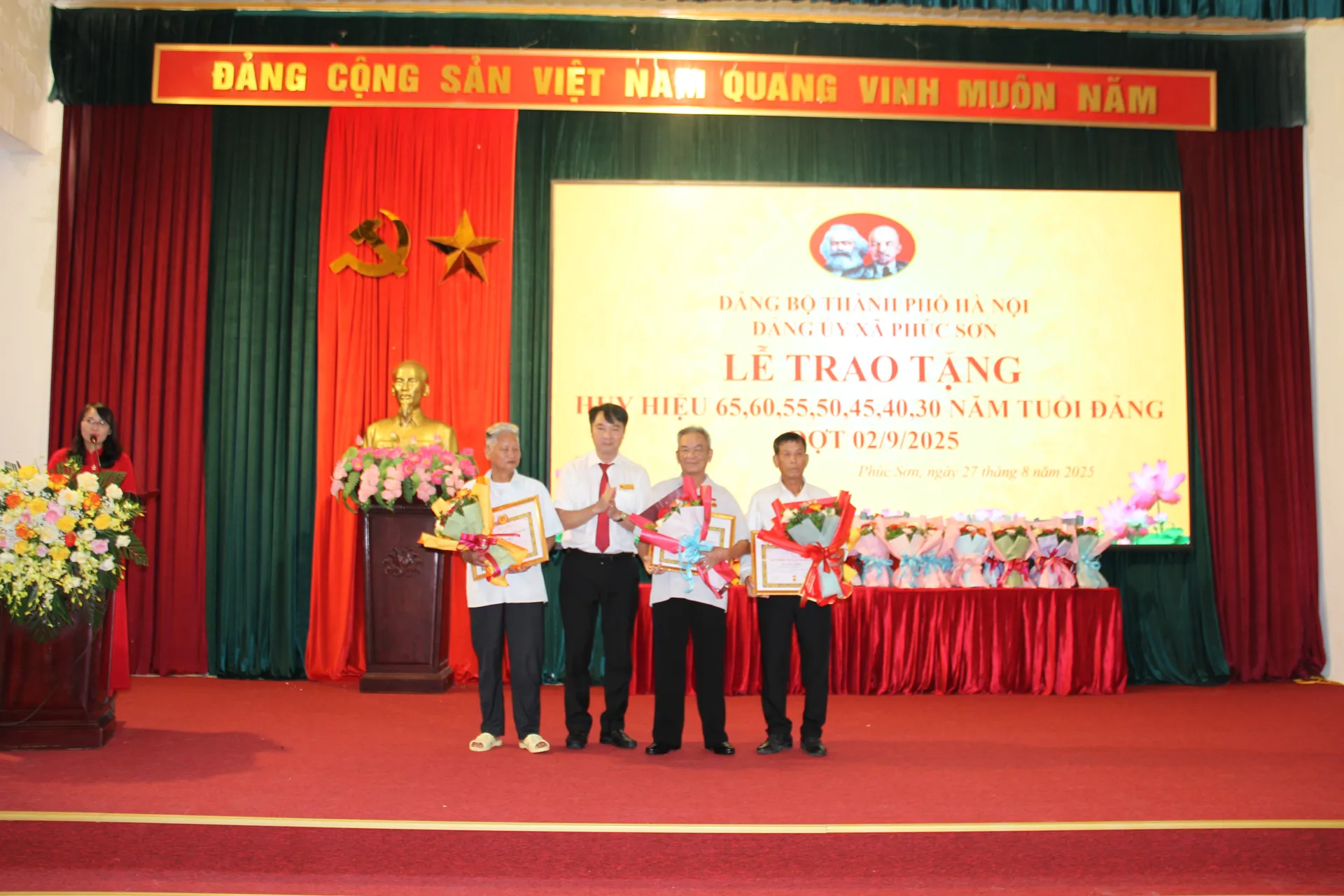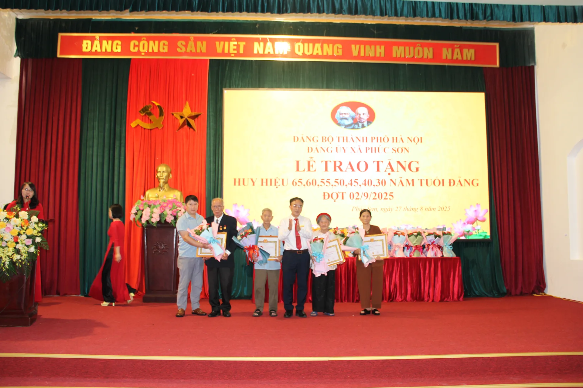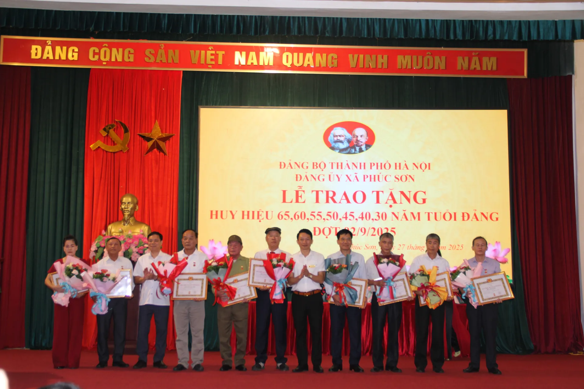 Theo đó, đợt 2/9/2025, toàn Đảng bộ xã Phúc Sơn có 2 đồng chí nhận Huy hiệu 65 năm tuổi Đảng, 3 đồng chí nhận Huy hiệu 60 năm tuổi Đảng, 2 đồng chí nhận Huy hiệu 55 năm tuổi Đảng, 4 đồng chí nhận Huy hiệu 50 năm tuổi Đảng, 12 đồng chí nhận Huy hiệu 45 năm tuổi Đảng, 10 đồng chí nhận Huy hiệu 40 năm tuổi Đảng và 12 đồng chí nhận Huy hiệu 30 năm tuổi Đảng và truy tặng huy hiệu 40 năm tuổi Đảng đối với đồng chí Trần Thị Dung, đảng viên Chi bộ thôn Vĩnh Lạc.