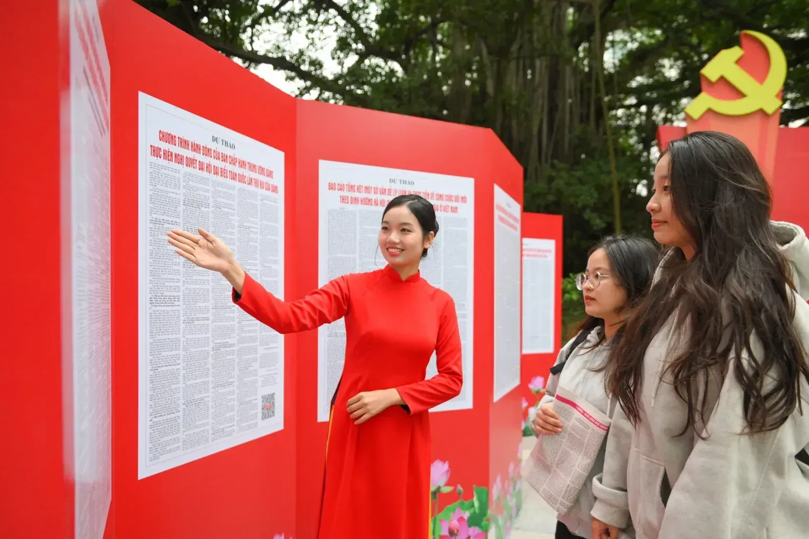 Không gian trưng bày “Toàn văn Dự thảo các văn kiện Đại hội XIV của Đảng” tại trụ sở Báo Nhân Dân thu hút người dân thủ đô đến đọc và tham quan. (Ảnh: Thế Đại)