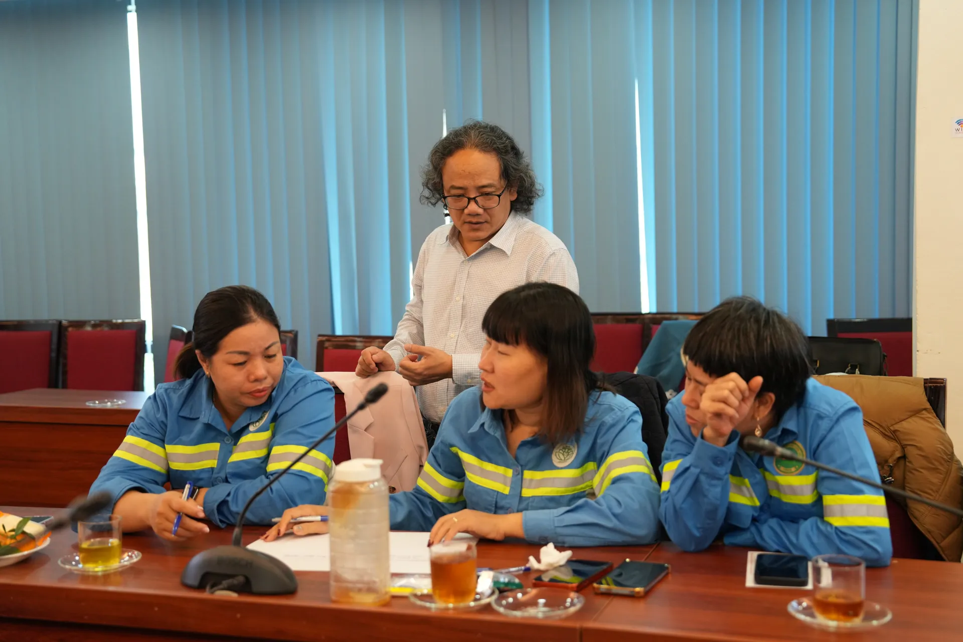 Tại buổi tập huấn, các nhóm đã trao đổi về những bất cập, rủi ro trong quá trình thực hiện công việc cũng như những rủi ro về tai nạn lao động hoặc trang thiết bị, bảo hộ lao động. BS Trần Triêu Ngoã Huyến Trưởng Nhóm Nòng cốt cùng các thành viên tham gia góp ý vào phiếu khảo sát câu hỏi và cách điền thông tin vào phiếu khảo sát. BS Trần Triêu Ngoã Huyến cũng giải đáp nhiều thắc mắc, góp ý của các thành viên trong Nhóm trong công tác thu thập dữ liệu.